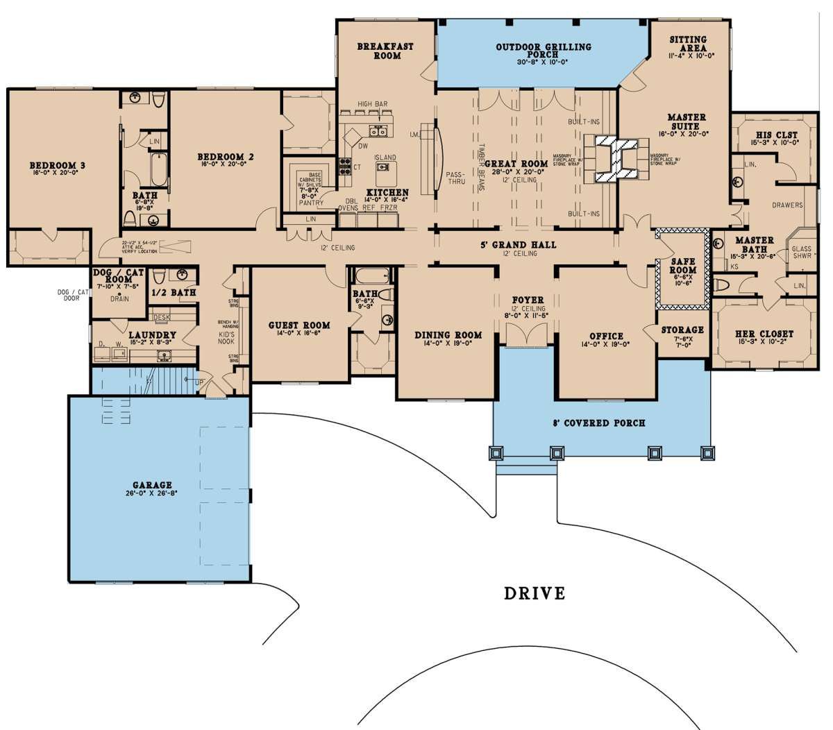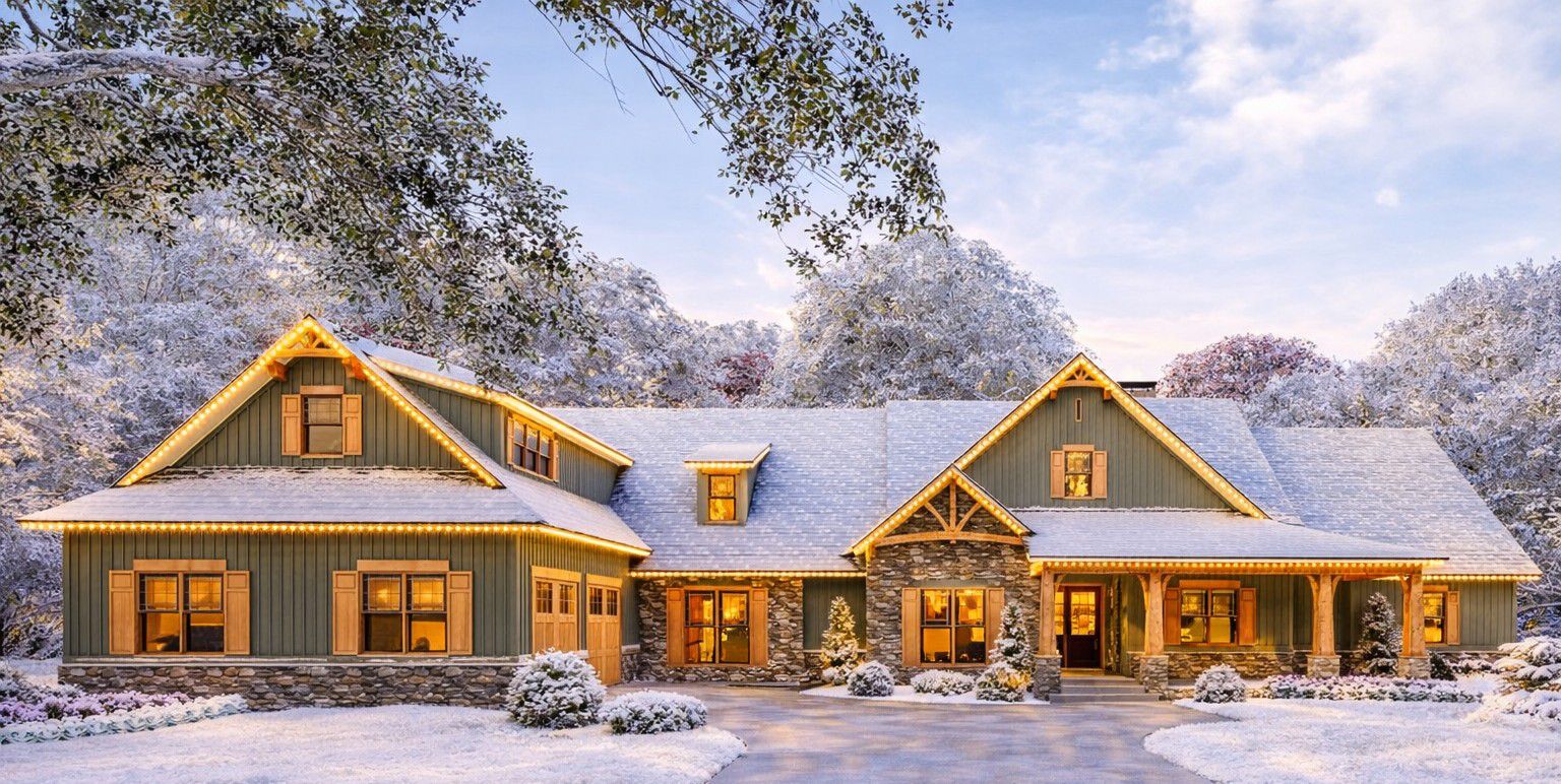 This plan leans into a classic country-craftsman vibe with a wide, grounded footprint and a roofline that feels substantial. The home spans about 117′ 9″ wide and 81′ 10″ deep, with an overall height around 30 feet—so it has that estate-style presence without requiring a second story to pull it off.