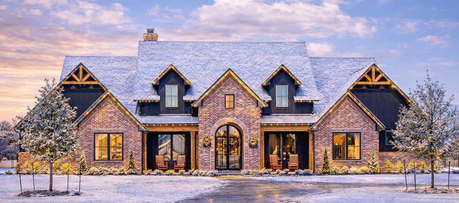 The exterior showcases a harmonious mix of brick, wood, and metal accents that emphasize perfect symmetry and transitional style curb appeal. A pair of **arched French doors** at the front entry opens to a vaulted and beamed foyer, setting the tone for graceful design throughout.