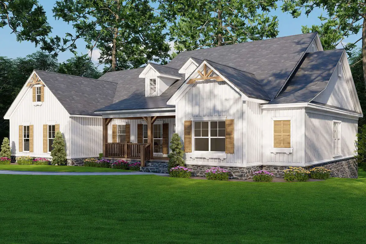 The exterior of this modern farmhouse presents clean lines and balanced proportions that deliver strong curb appeal. This one-story design features a welcoming **front porch** and classic farmhouse roofline.