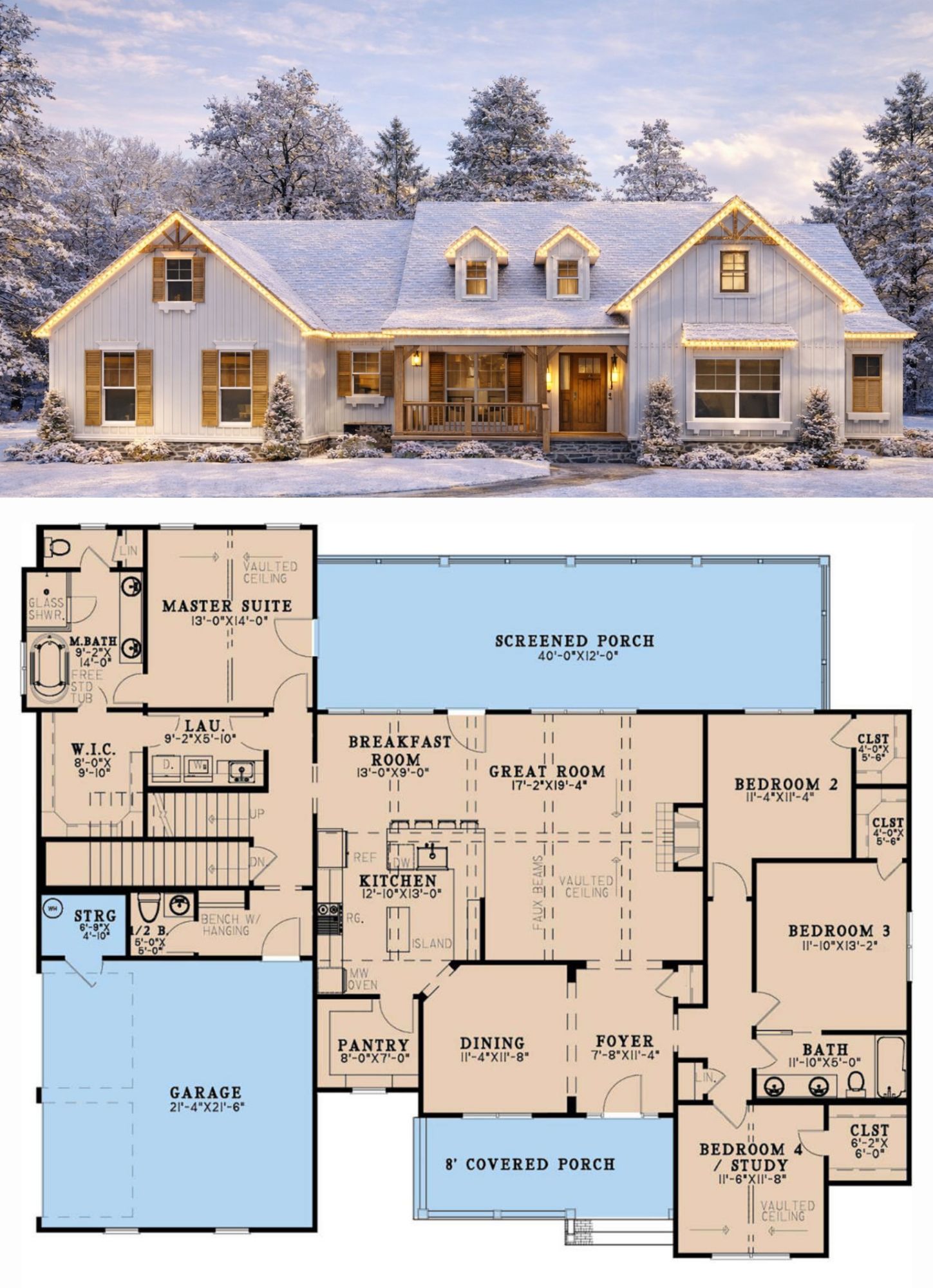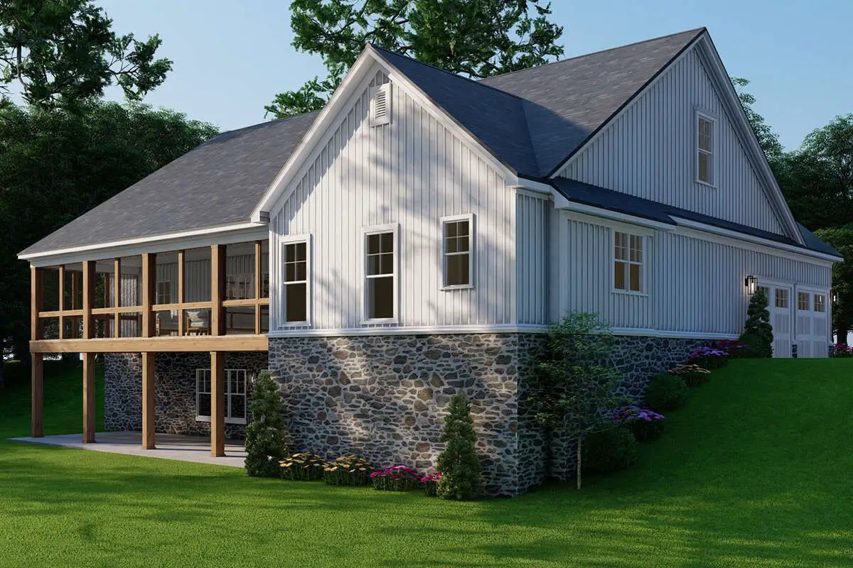 This farmhouse design emphasizes open flow and functional spaces that work for everyday routines and special occasions alike. The connection between the great room and outdoor porch areas makes it easy to enjoy fresh air while entertaining, and the thoughtful separation of bedroom zones enhances privacy and tranquility. 22