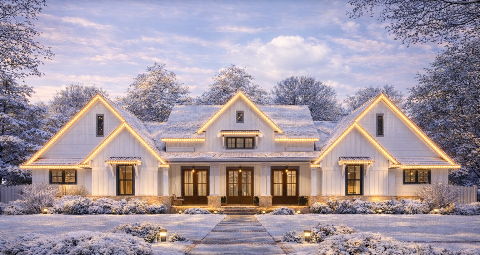 This home leans into symmetry in the best way—balanced, polished, and instantly eye-catching. The exterior mix gives it that modern farmhouse personality: classic vertical siding vibes paired with clean lines and extra detail that makes the whole façade feel layered instead of flat.