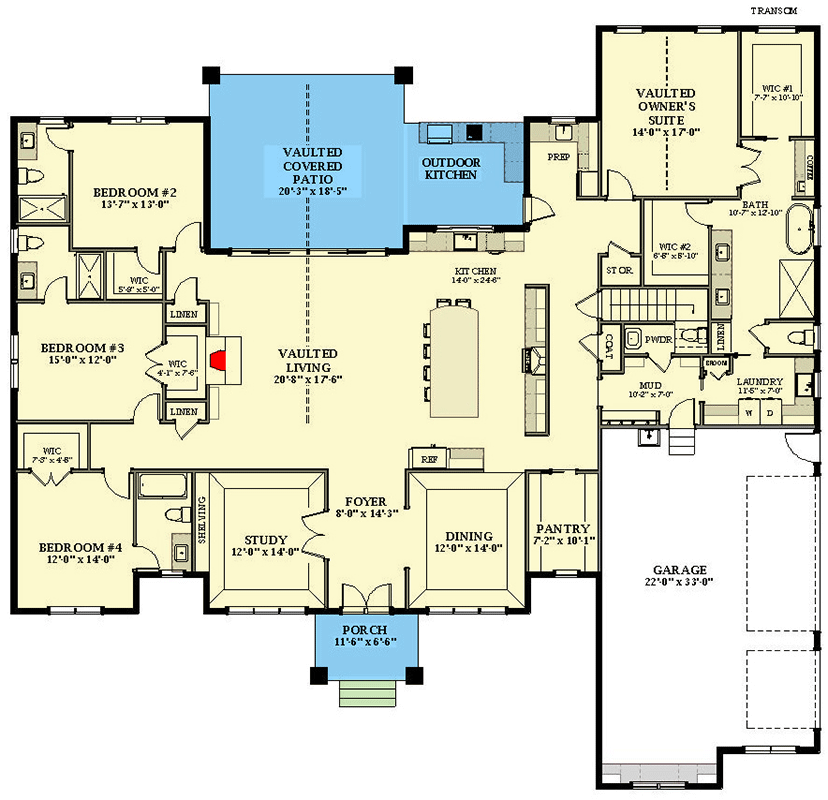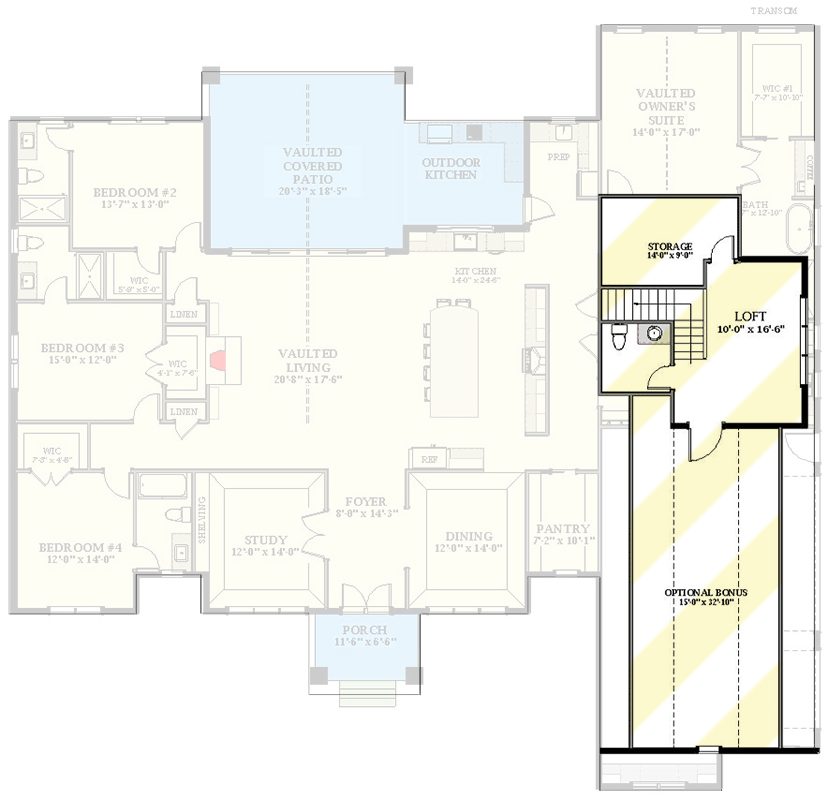 This Transitional Country house plan is perfect for families who appreciate both casual daily living and entertaining space. The open main living areas and covered patio encourage gatherings, while the private owner’s suite and additional bedrooms provide distinct zones for rest and retreat. With flexible spaces like the study and bonus room, this design adapts to work, play, and future needs alike. 22