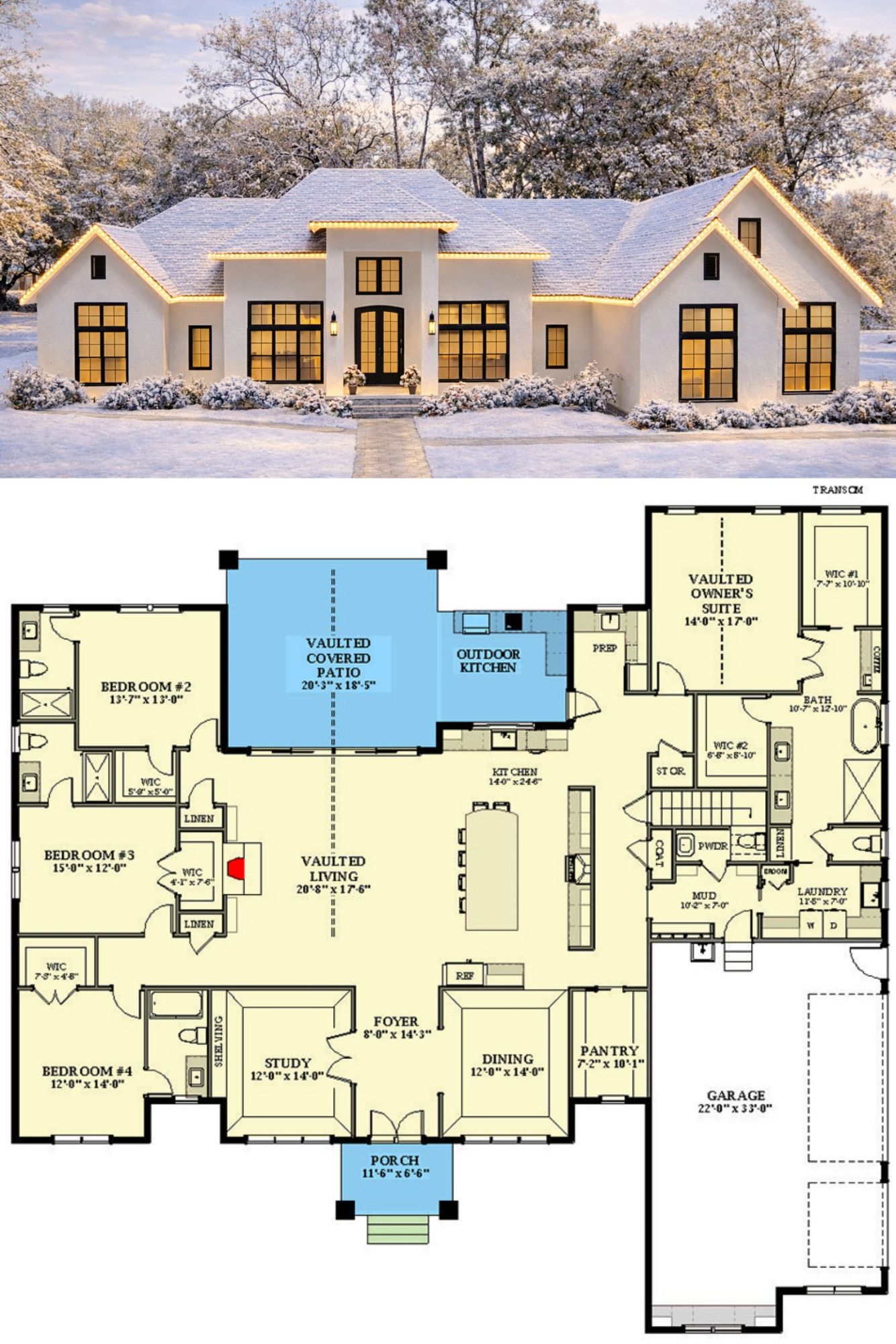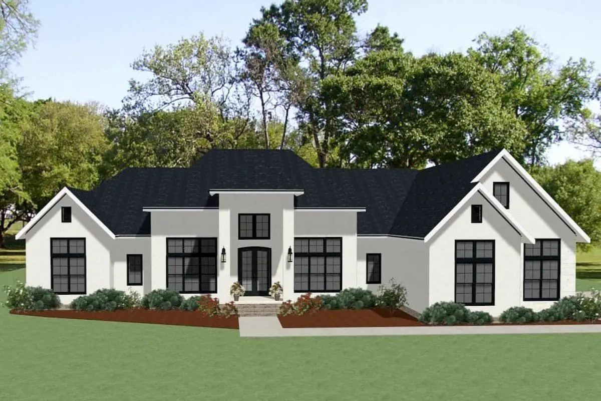 This elegant **Transitional Country house plan** offers a blend of classic charm and modern design, with about 3,637 square feet of heated living space.