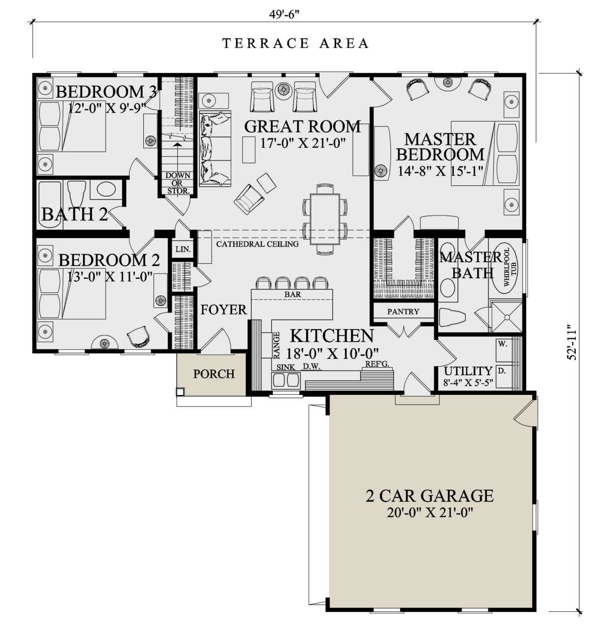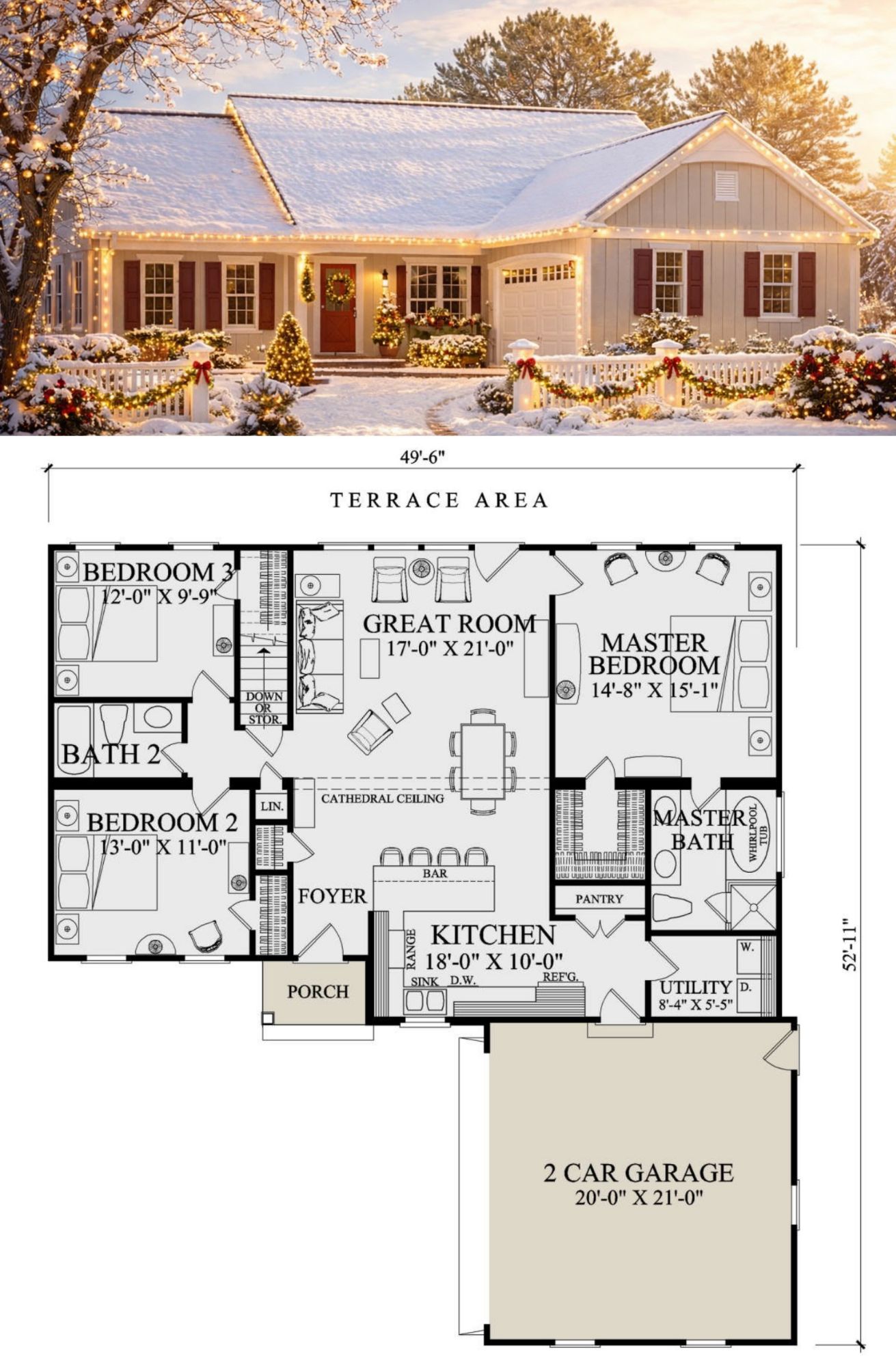 - Overall Dimensions: 49′ 6″ W × 52′ 11″ D