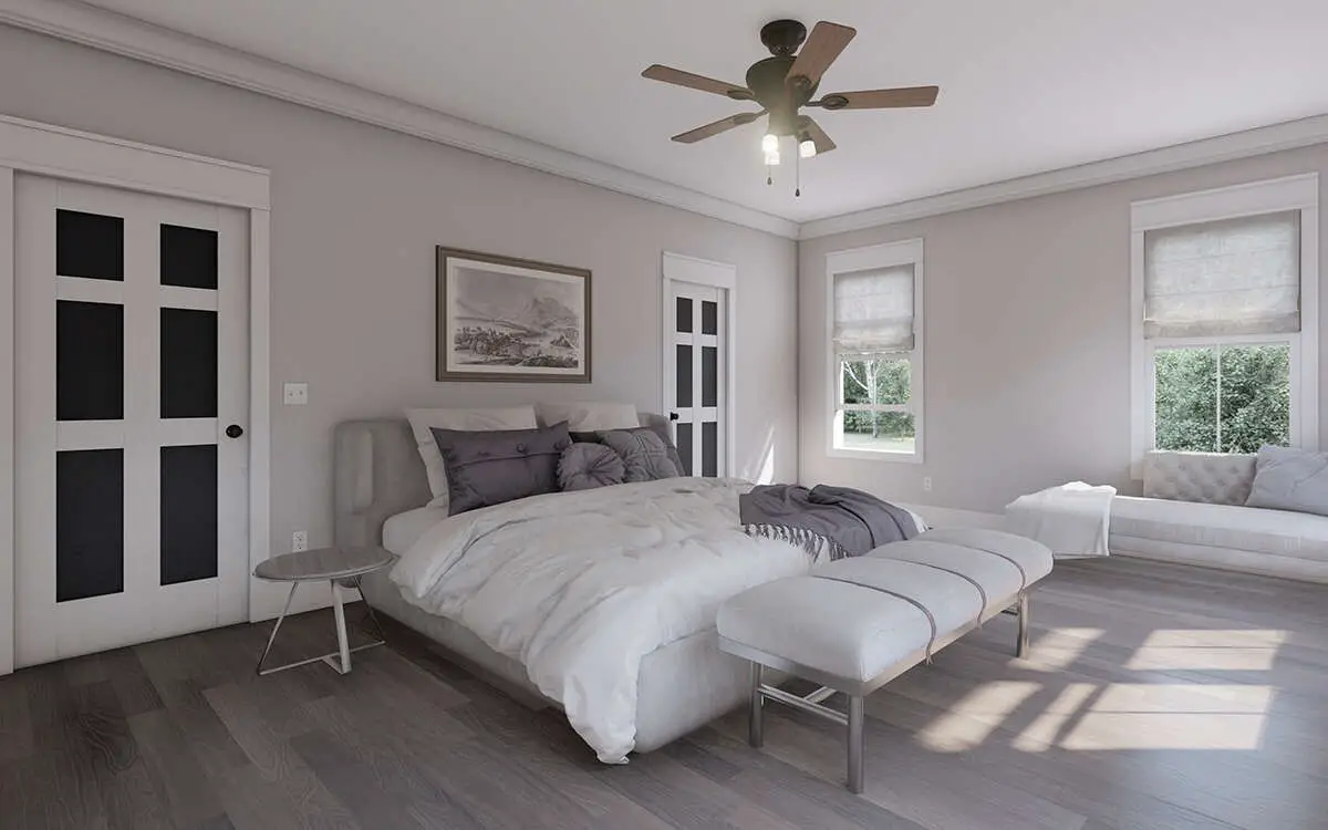 This plan includes **5 bedrooms**, giving plenty of room for family members, guests, or flexible use as home offices or hobby spaces. The primary suite has impressive volume with higher ceilings, a spacious walk-in closet, and easy access to bathroom amenities. 5