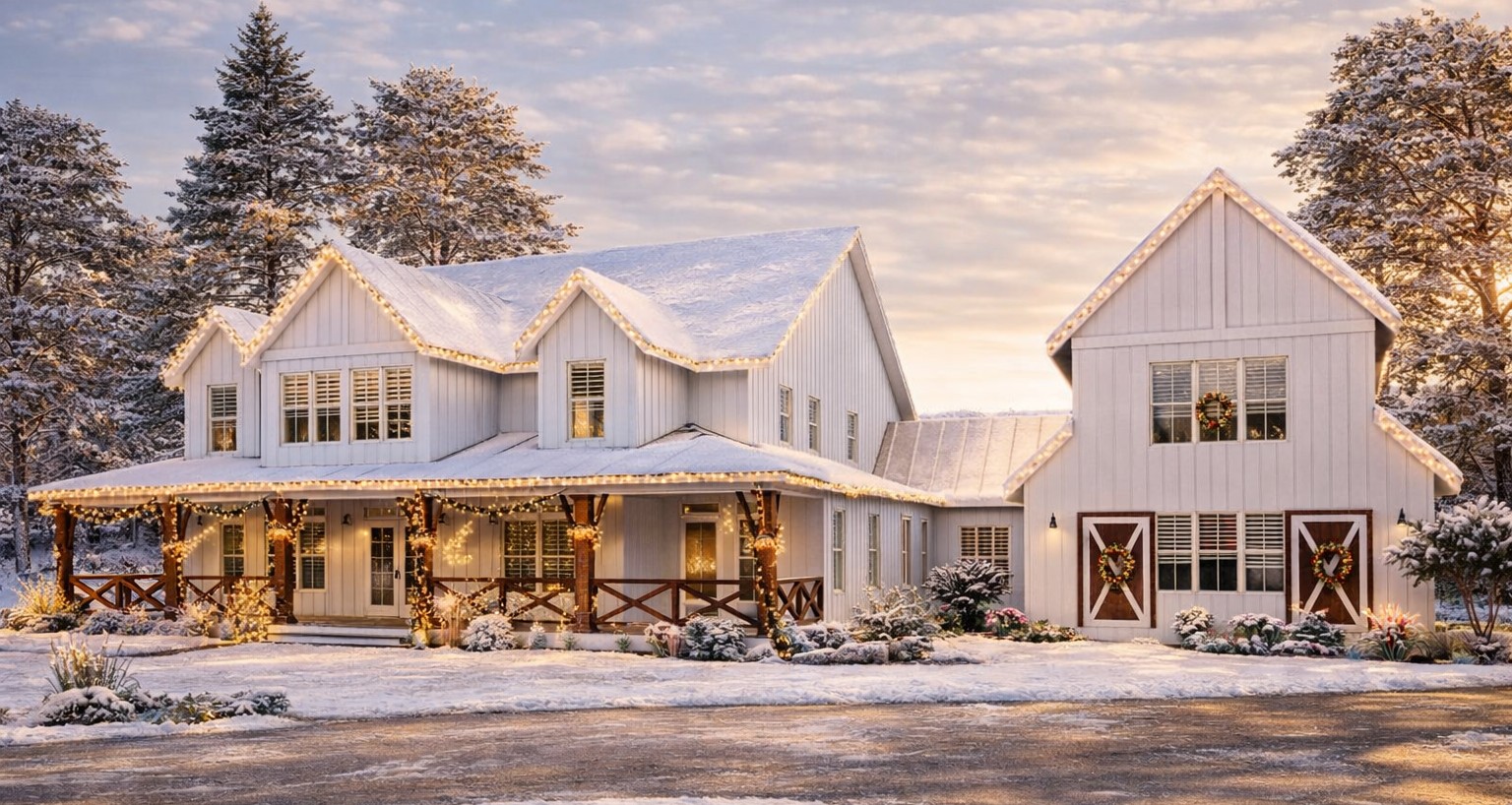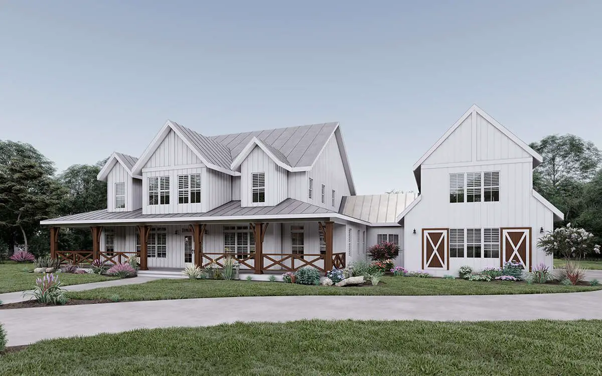 The exterior blends classic farmhouse inspiration with sleek modern lines. The wide facade spans **about 92′** and is anchored by a welcoming **covered front porch** that stretches across much of the home’s front, ideal for rocking chairs and seasonal décor.