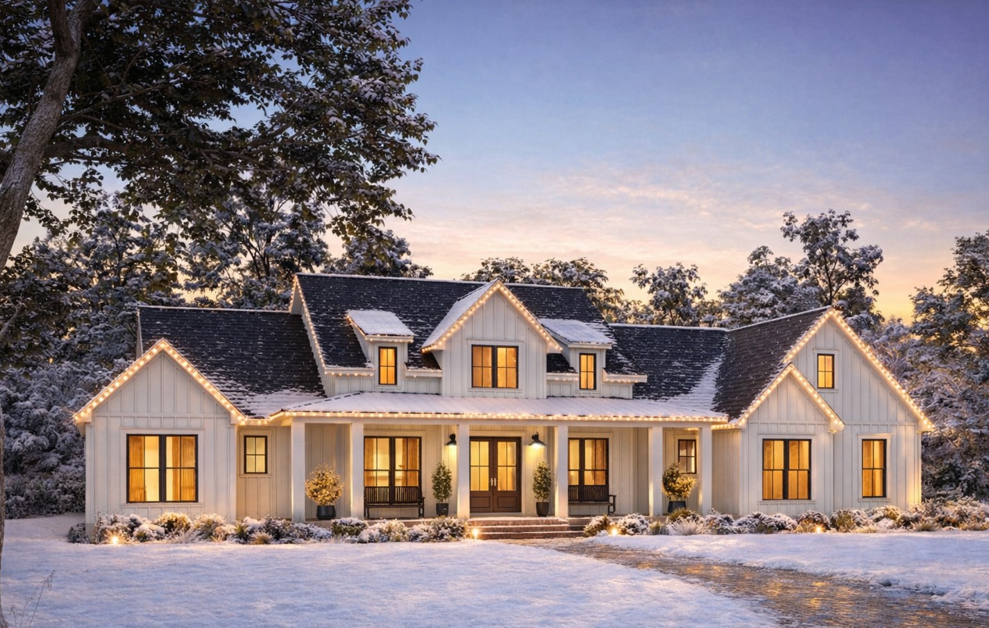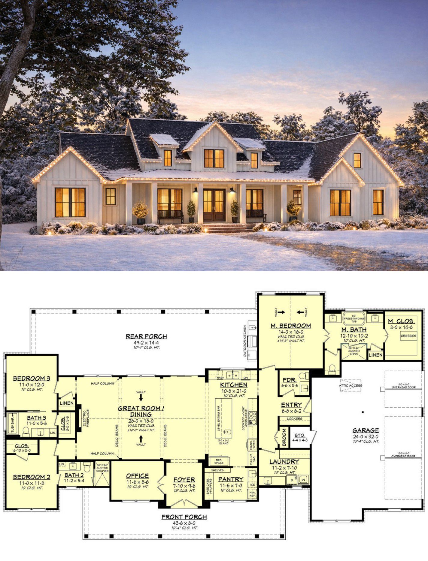 The exterior embraces modern farmhouse charm with balanced proportions, crisp rooflines, and welcoming porch elements that enhance curb appeal. With overall dimensions near **74′-4″ wide × 57′-10″ deep**, this home fits comfortably on many lot types while making a bold, stylish statement.