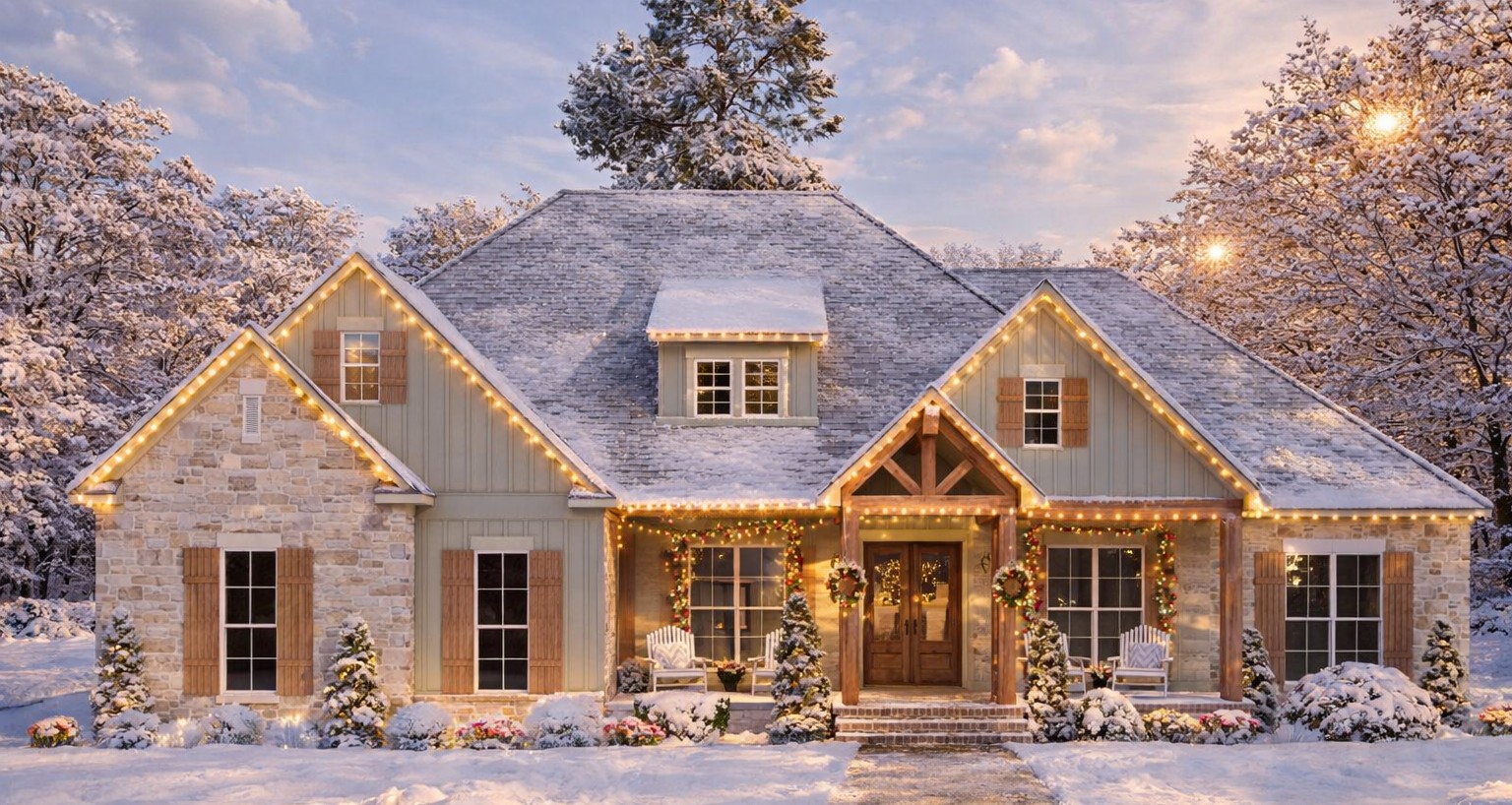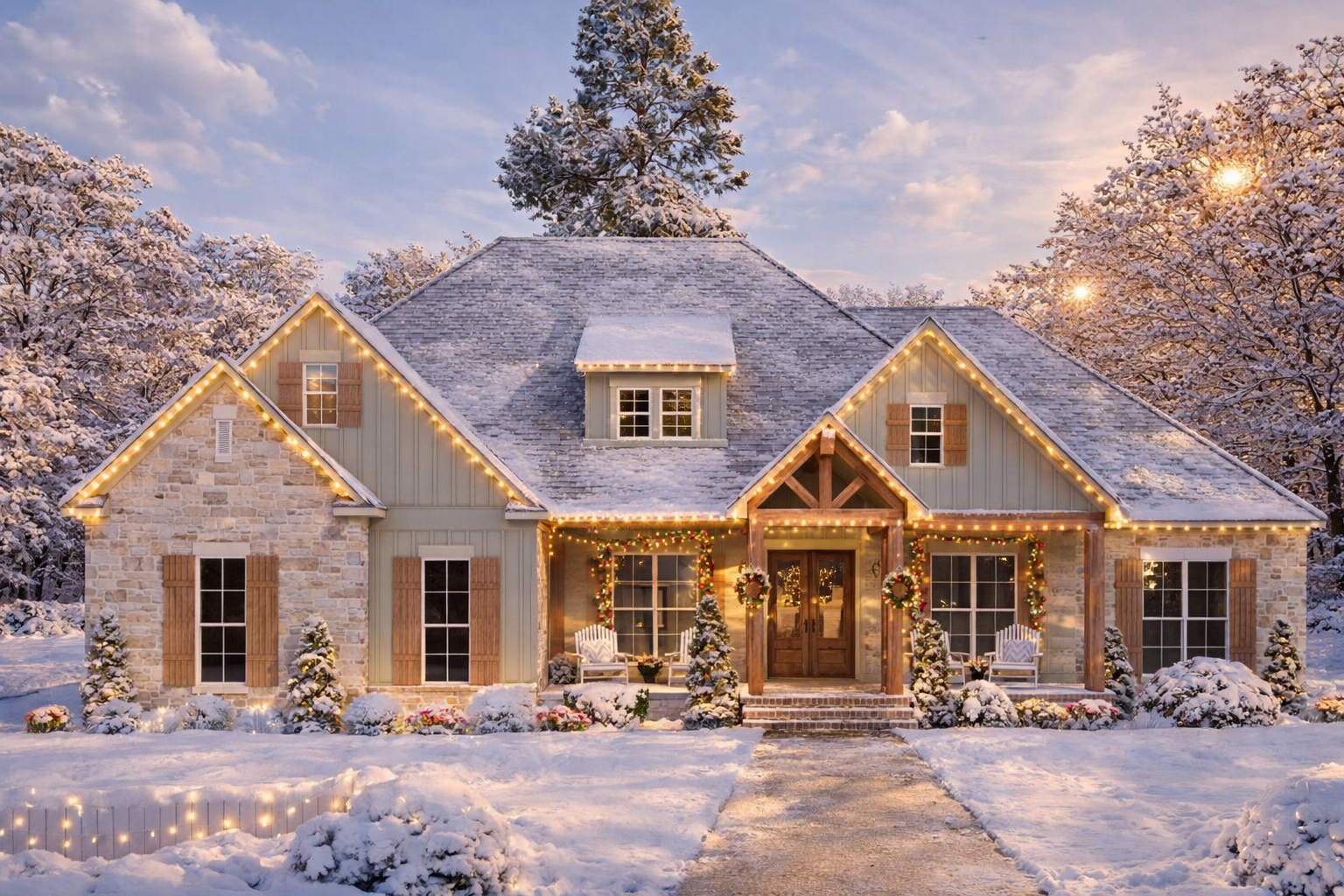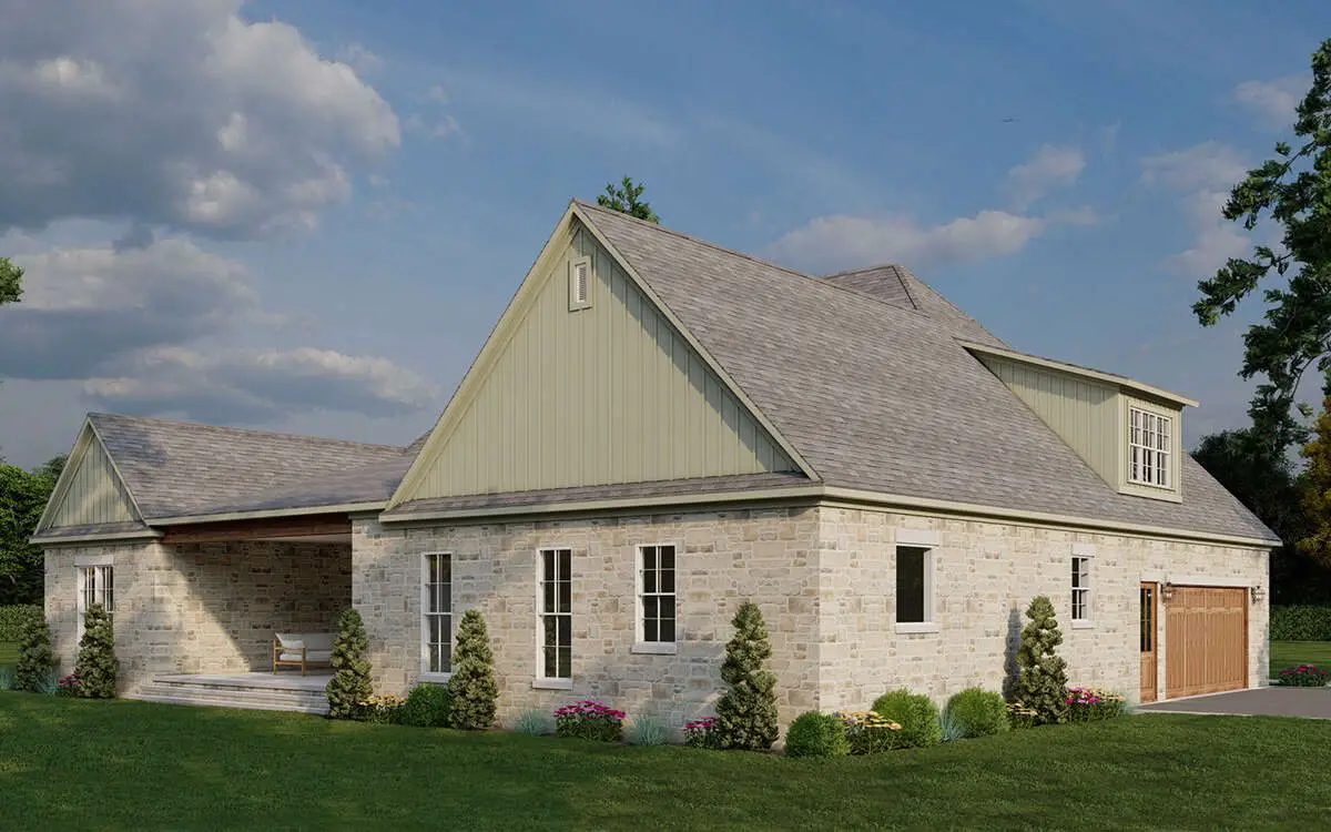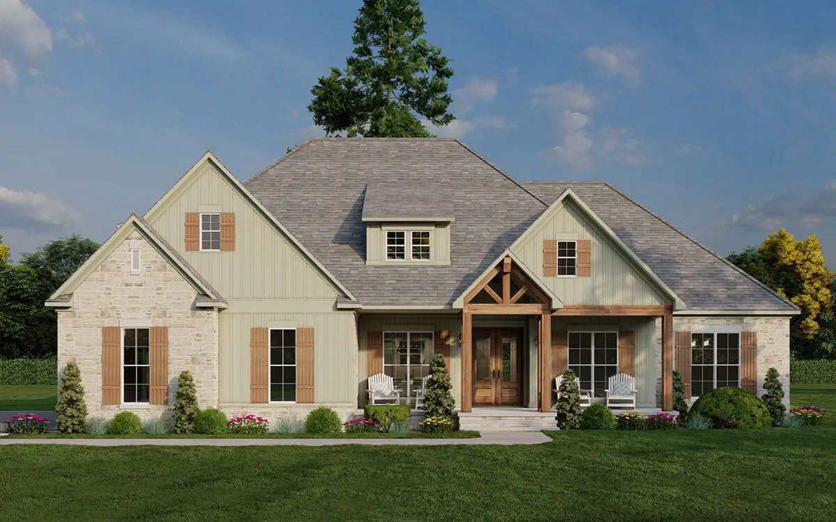 The exterior blends clean modern lines with classic farmhouse proportions. With an overall footprint of about 71′-6″ wide × 65′-6″ deep, the home presents a balanced, welcoming front elevation that fits a variety of lot sizes. 1