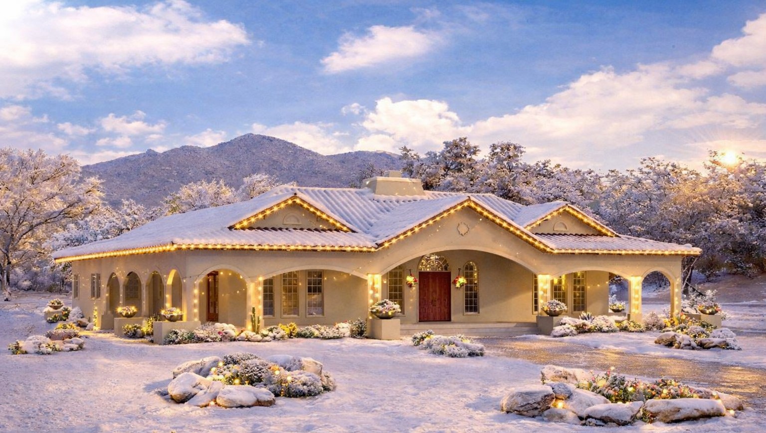The exterior showcases a blend of **Adobe, Mediterranean, Florida-style, and Southwest architectural influences**, resulting in a warm yet distinctive look that works beautifully in multiple climates and settings. The home spans roughly **75ʹ 2″ wide × 68ʹ 8″ deep** with a modest ridge height of about **19 ft**, giving it approachable, grounded proportions that don’t overwhelm the site. 1
