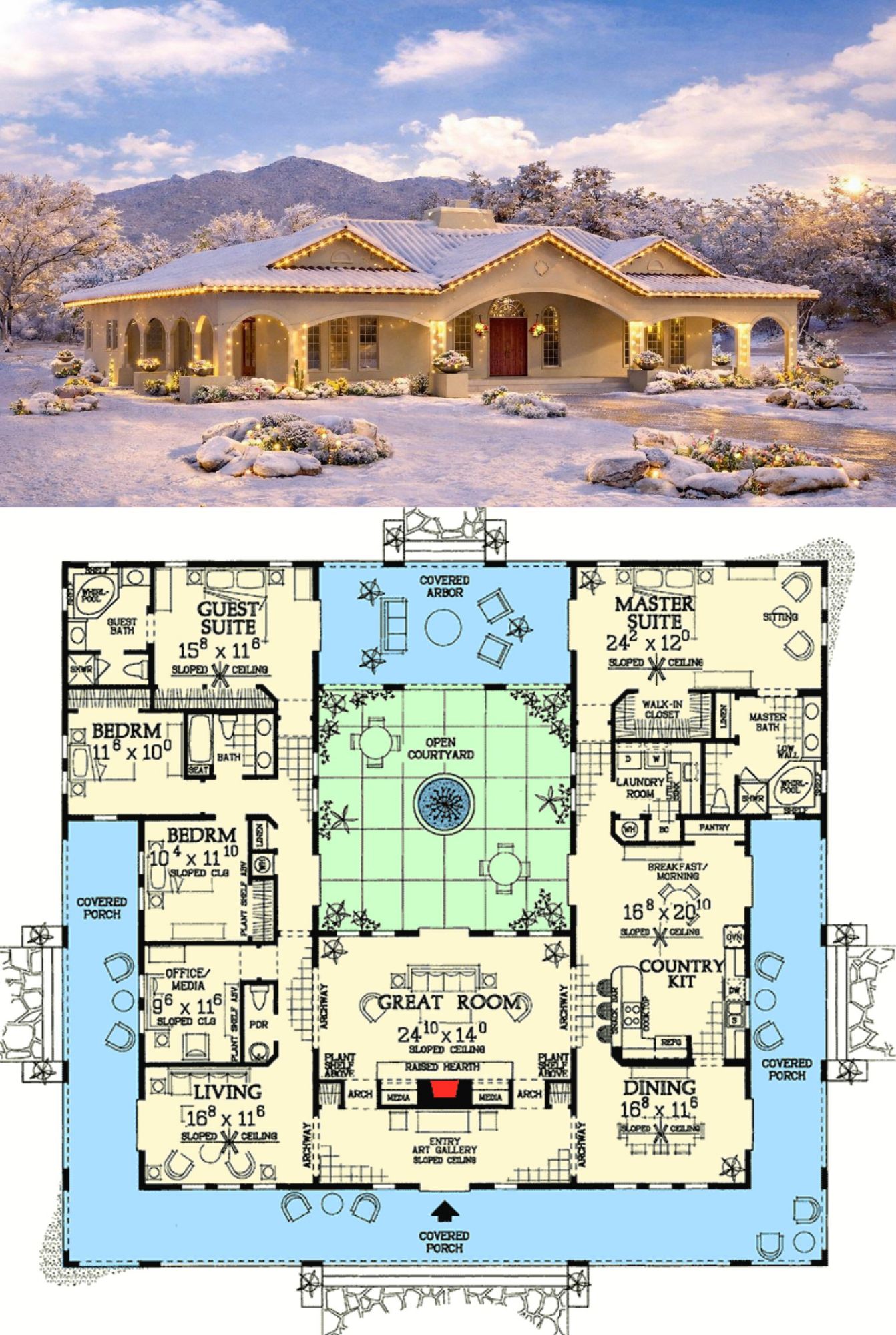 This striking open courtyard home plan blends indoor elegance with outdoor livability, creating an ideal balance for today’s relaxed lifestyle.