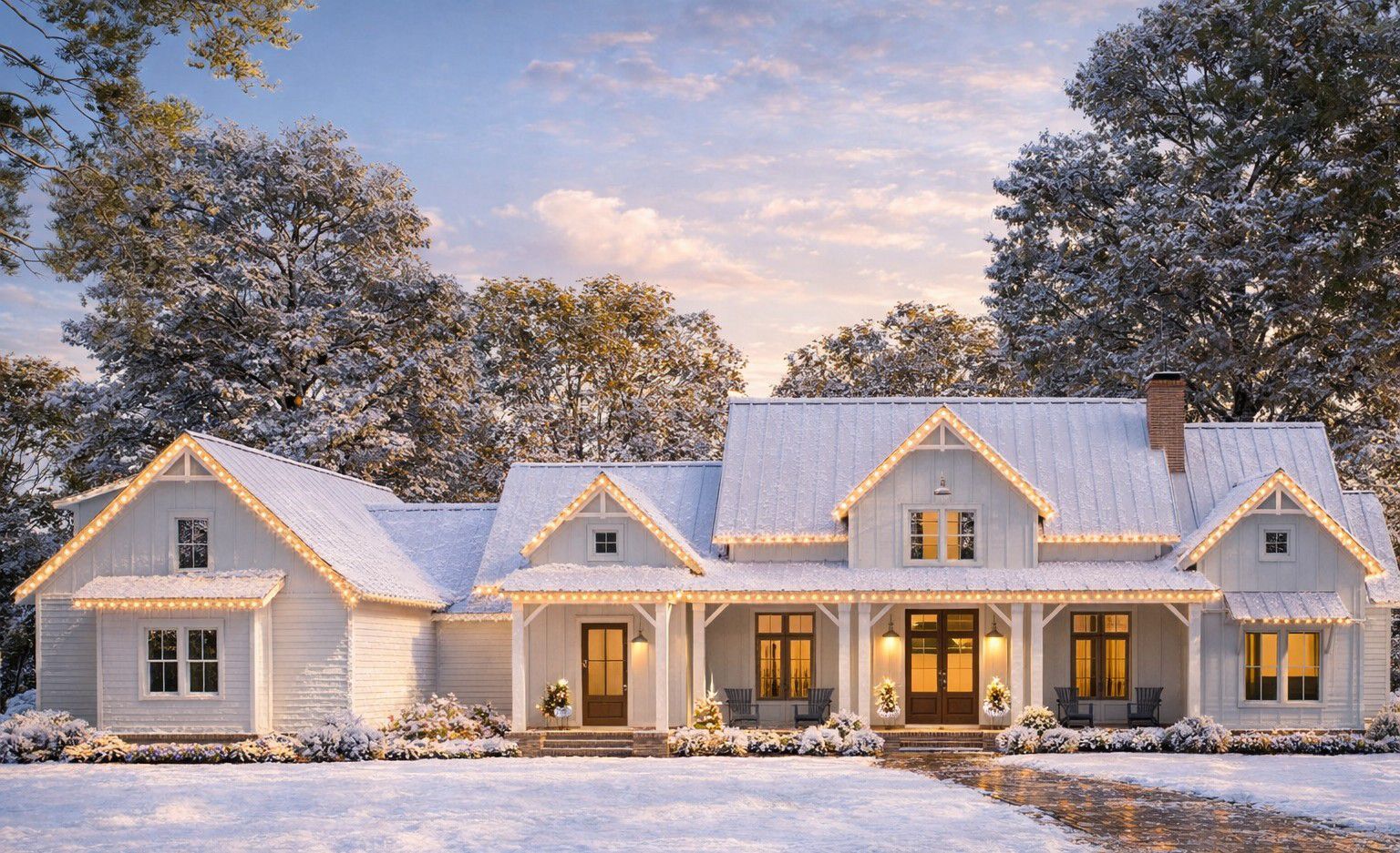 The exterior leans into modern farmhouse style with a layered, high-end mix of textures and classic forms.