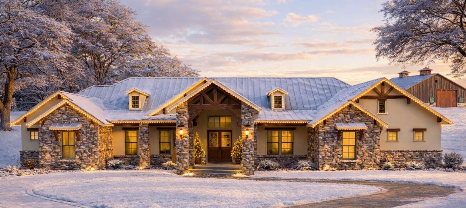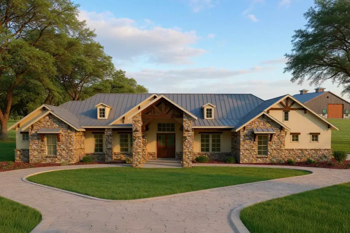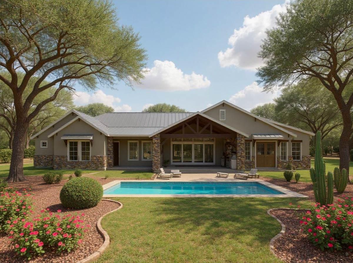 The façade blends classic Hill Country and Southwest influences with stone accents and deep covered porches that create instant curb appeal.