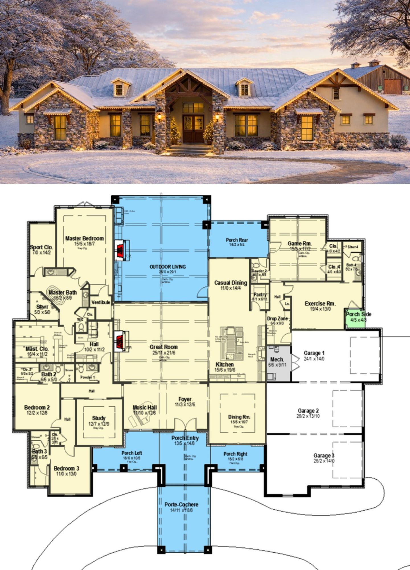 This elegant Hill Country plan is perfect for families who want a blend of refined indoor spaces and generous outdoor living. The music hall and game room add unique lifestyle value, while the open plan and expansive porches encourage seamless indoor-outdoor flow. Thoughtful layout choices like split bedroom zones, dedicated study space, and direct laundry access from the primary suite make daily life easier and more enjoyable for everyone. 11