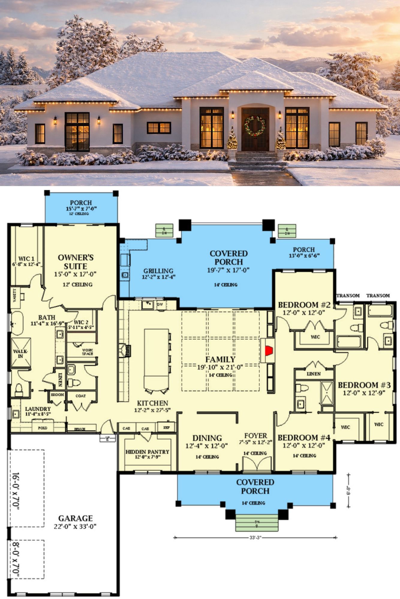 This modern transitional plan is ideal for families who want a balance of open living and private retreats. The combination of formal and casual spaces lets you host dinner parties, manage daily routines, or simply relax with family without feeling like rooms are isolated from one another. Generous outdoor porch spaces extend the home’s livable area and provide seamless indoor-outdoor flow. 12