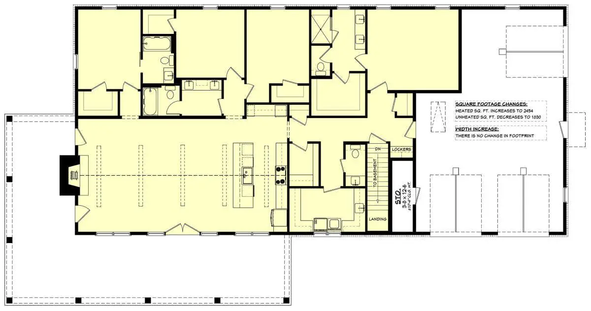 It’s a one-story design with 2,400 square feet of heated living space, four bedrooms, and three-and-a-half bathrooms—so you get the space you need without turning your daily life into a marathon between wings.