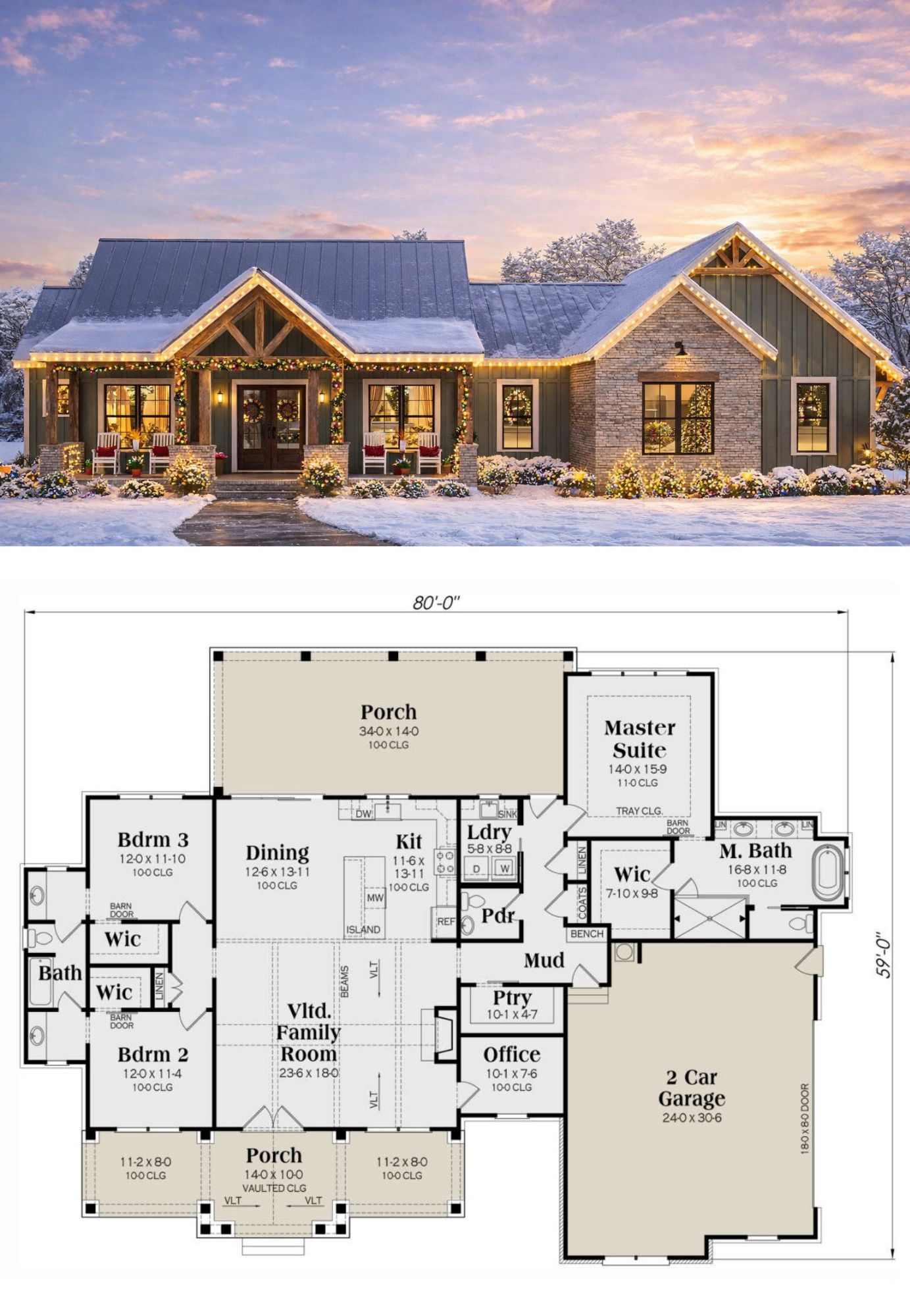 The home’s overall footprint is about **80′ wide × 59′ deep**, which creates a balanced presence that fits well on many lot types—from country settings to suburban streets.
