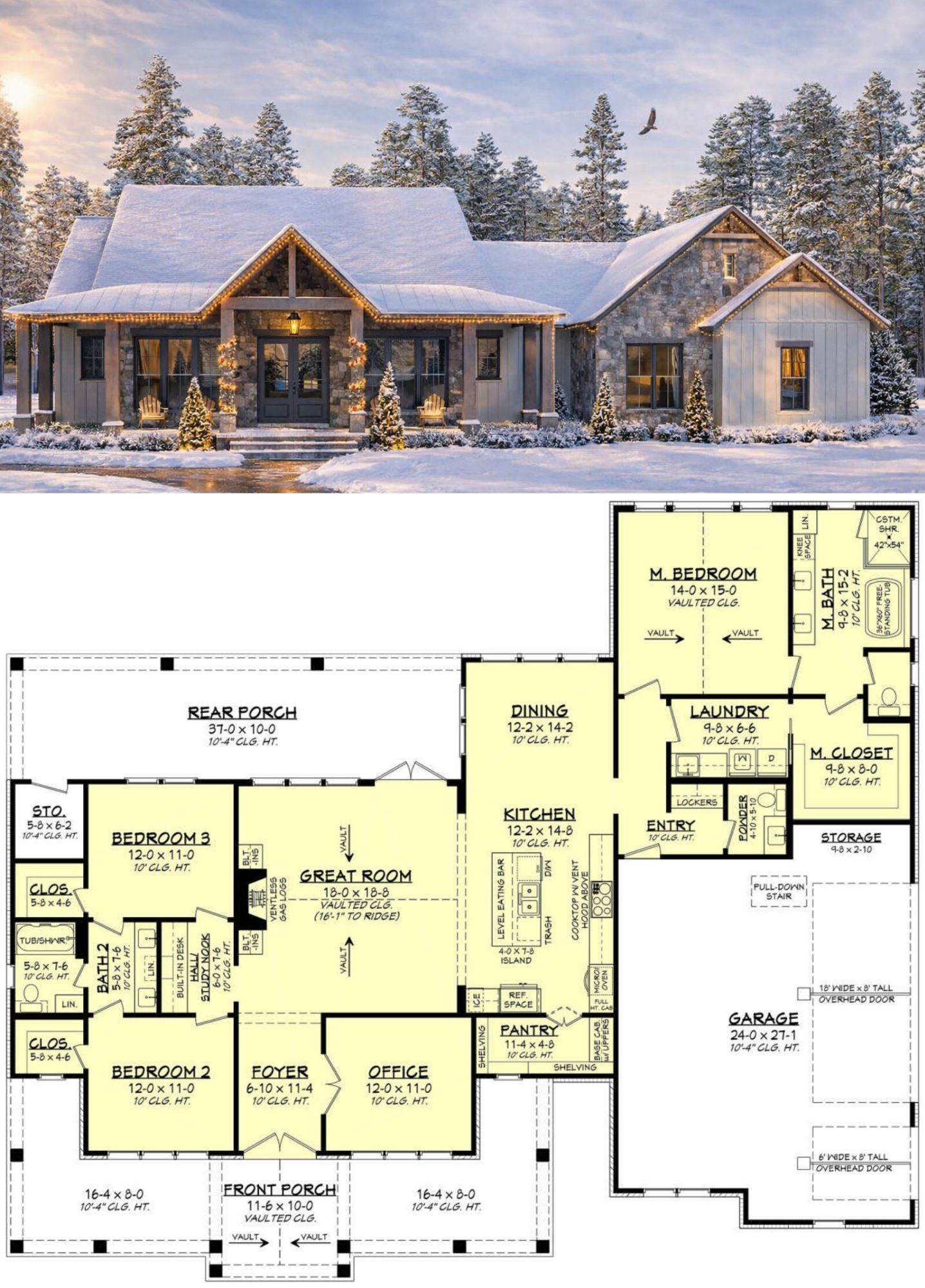 The exterior design merges timeless farmhouse details with modern simplicity, creating a home that feels both classic and fresh. With overall dimensions of about 74′-2″ wide × 63′-4″ deep, this plan offers a grounded footprint that works well on a wide variety of sites, from rural settings to suburban neighborhoods. 2