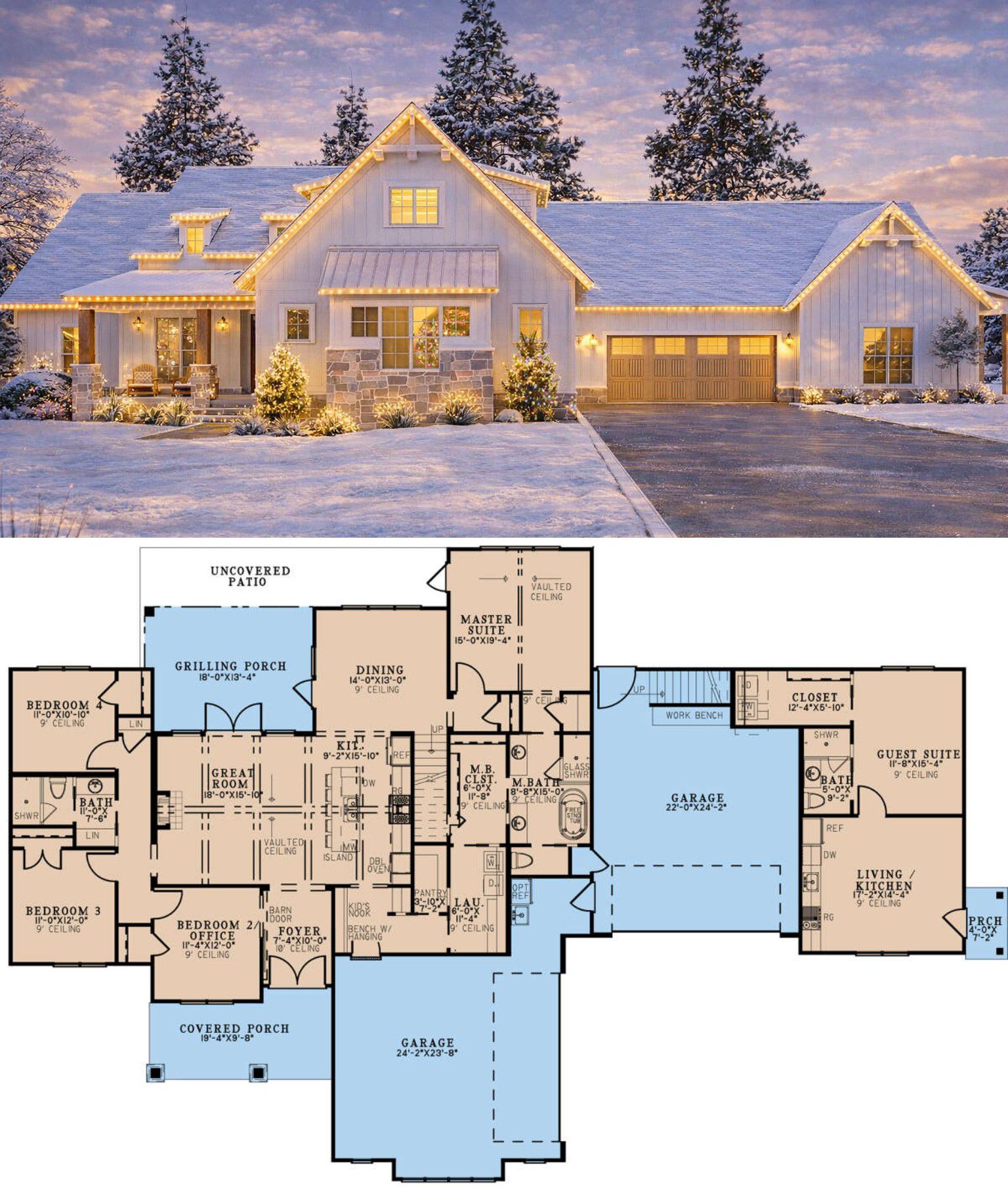 This modern farmhouse plan is designed for families who want spacious, open living without sacrificing privacy or daily convenience. The open main living zones invite connection, the separated bedroom areas provide restful retreats, and the bonus room gives extra flexibility as your needs change. Large garage space and thoughtful storage make everyday life easier. 13