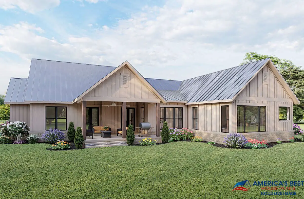 This rustic modern farmhouse feels like the best of both worlds: charming and welcoming on the outside, smart and comfortable on the inside. The porches bring the cozy farmhouse lifestyle, the open layout keeps the main living spaces bright and connected, and the bedroom arrangement protects privacy without sacrificing convenience.