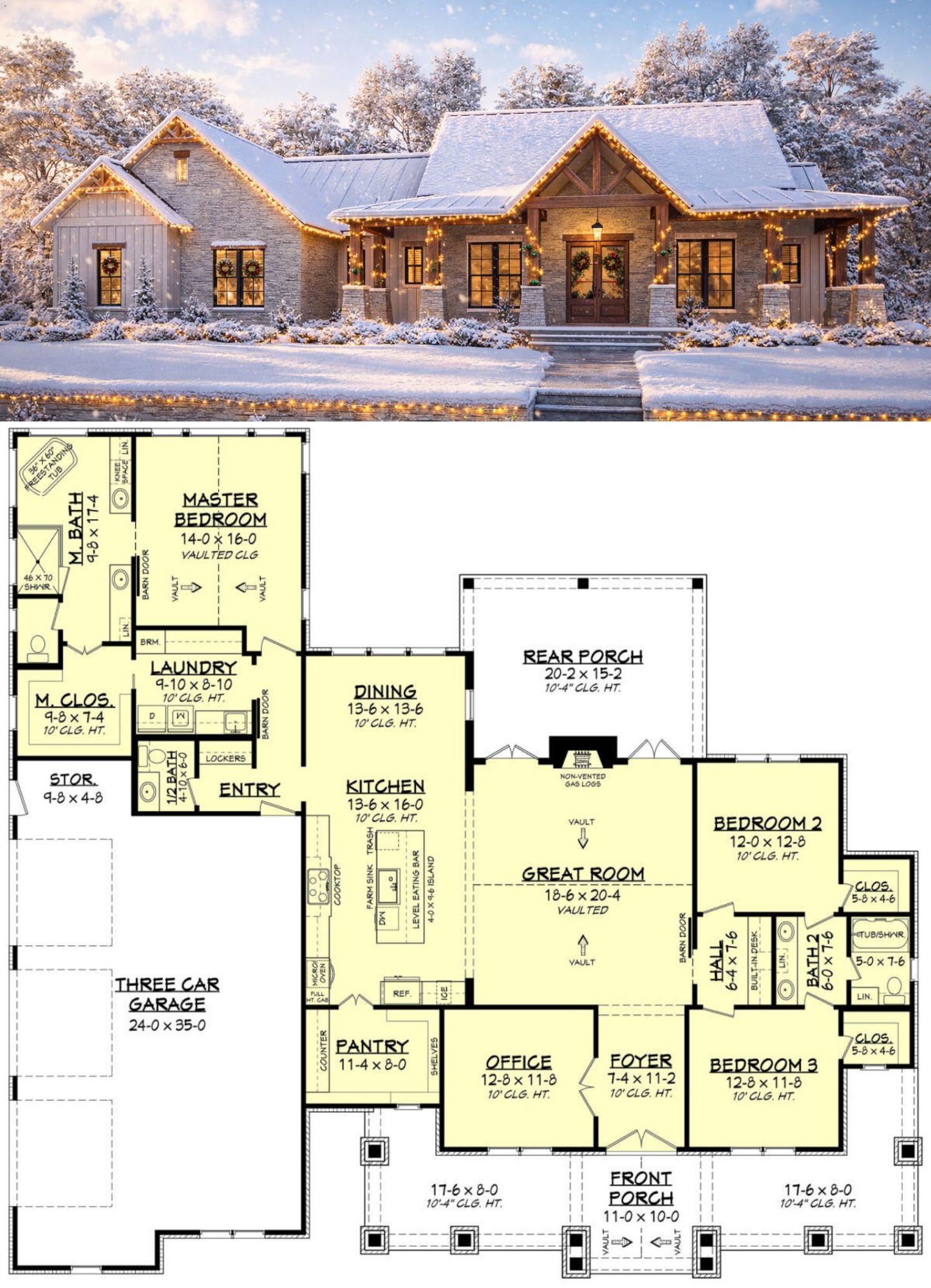 This is a single-story design with three bedrooms and two-and-a-half baths, but it lives larger thanks to thoughtful touches like a vaulted great room, a massive pantry, an office right up front, and a smart “drop zone” coming in from the garage.