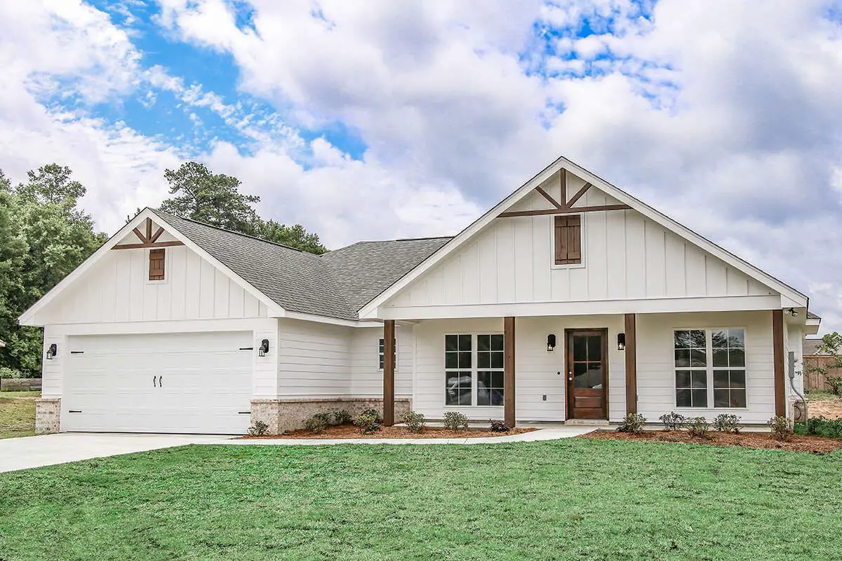 The exterior features classic modern farmhouse styling—clean lines, board-and-batten siding, mixed materials for visual interest, and a welcoming covered front porch that gives the home a warm, inviting curb presence.