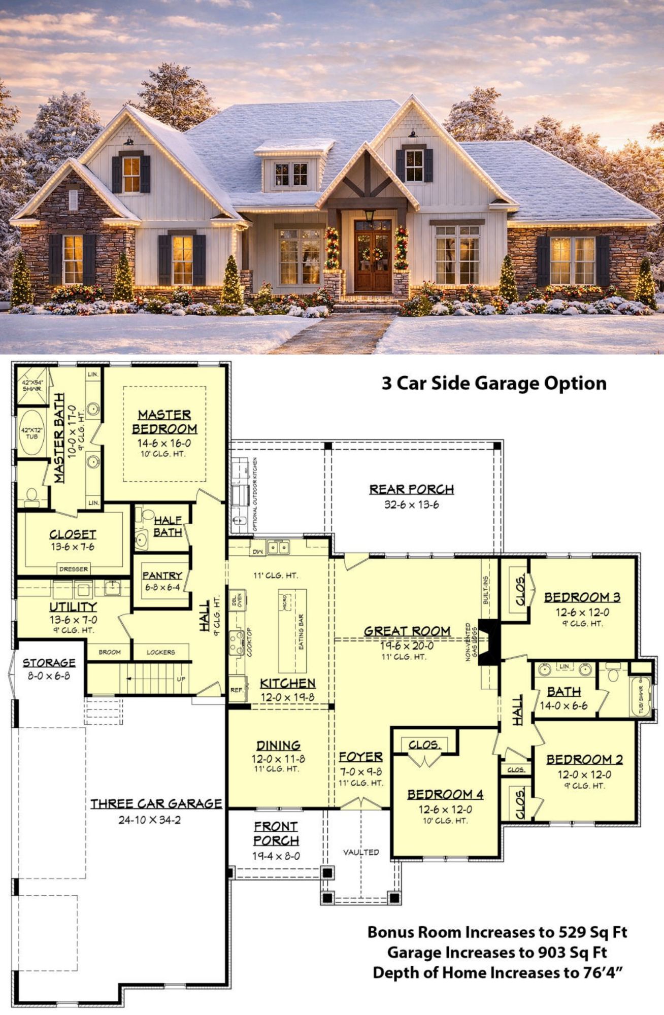Overall dimensions come in at approximately 76′ 4″ wide by 67′ 4″ deep, giving the home a substantial footprint that still fits comfortably on many lots. The main roof pitch is 9:12, which adds to the Craftsman character and curb appeal.