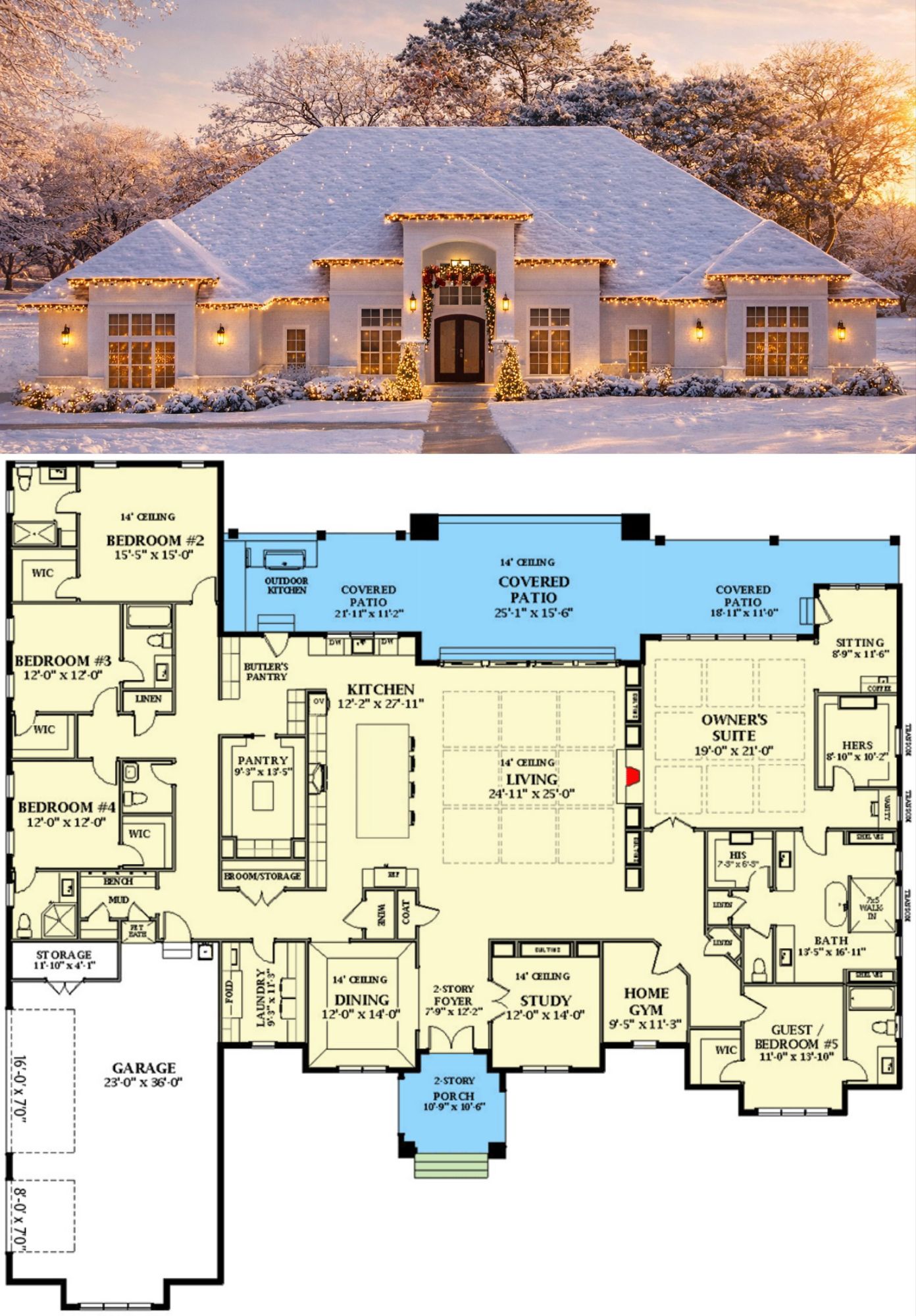 This elegant and functional **transitional house plan** delivers approximately 5,038 square feet of thoughtfully designed living space.