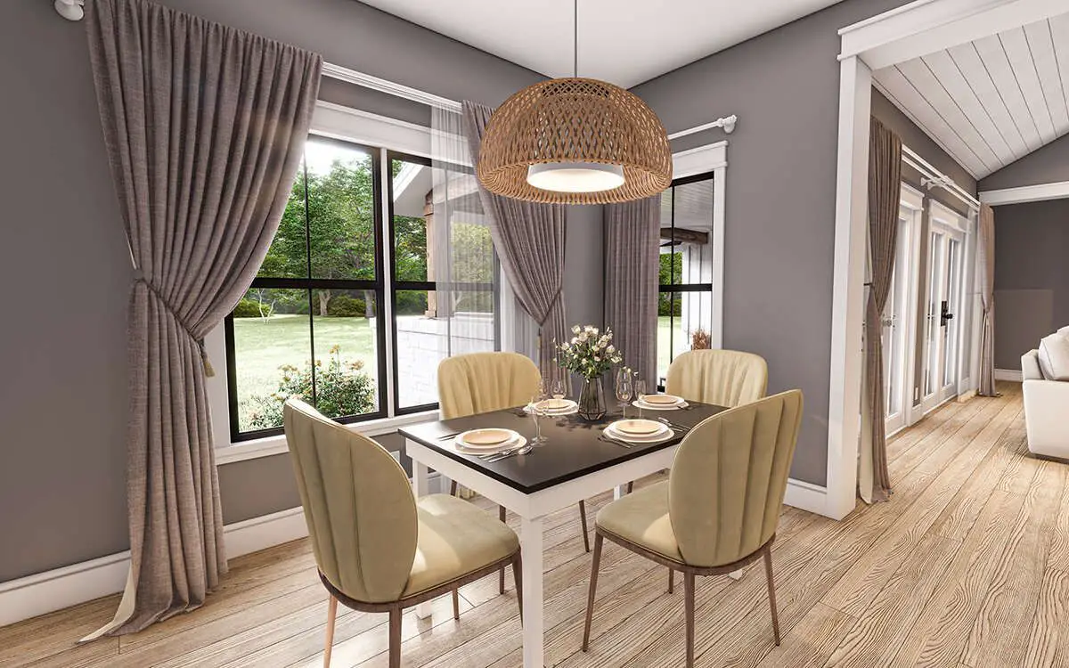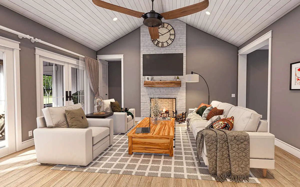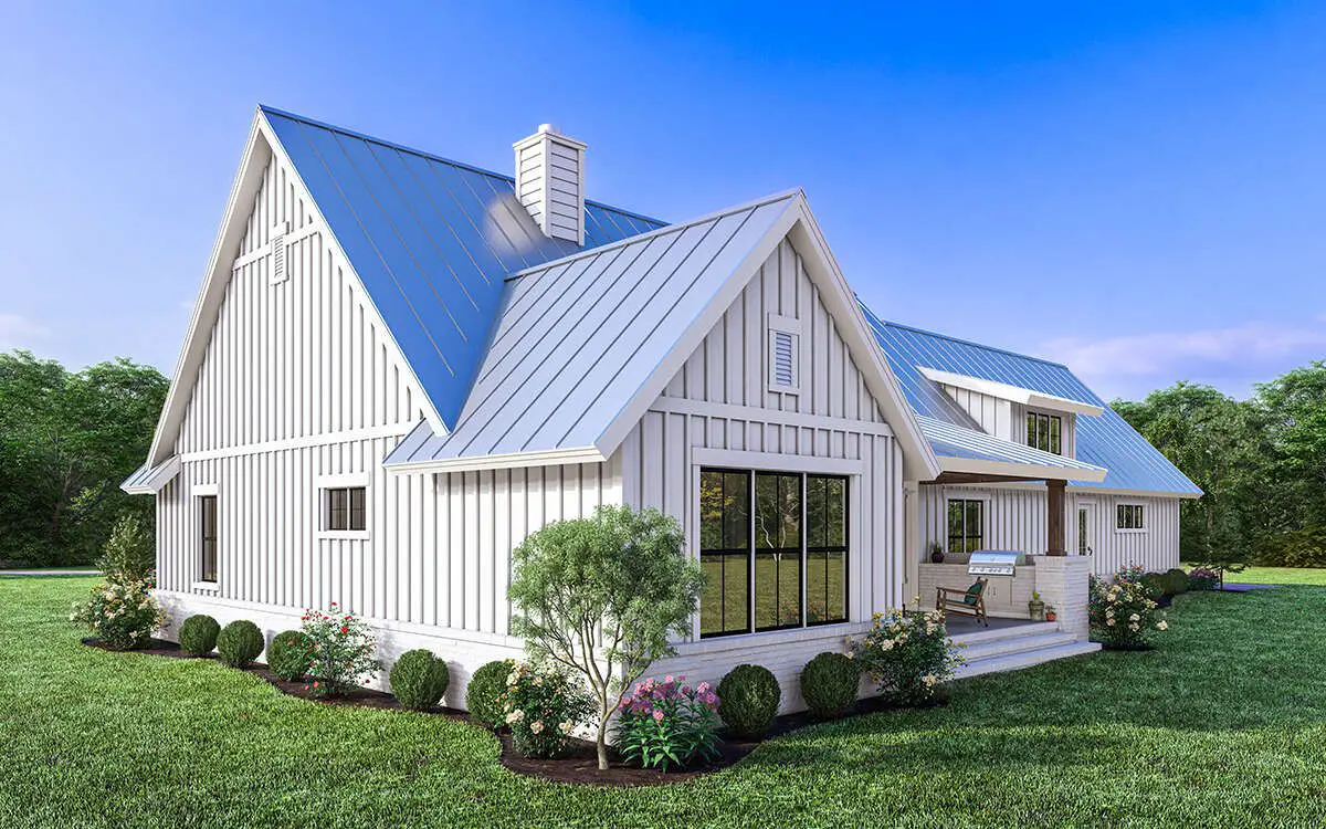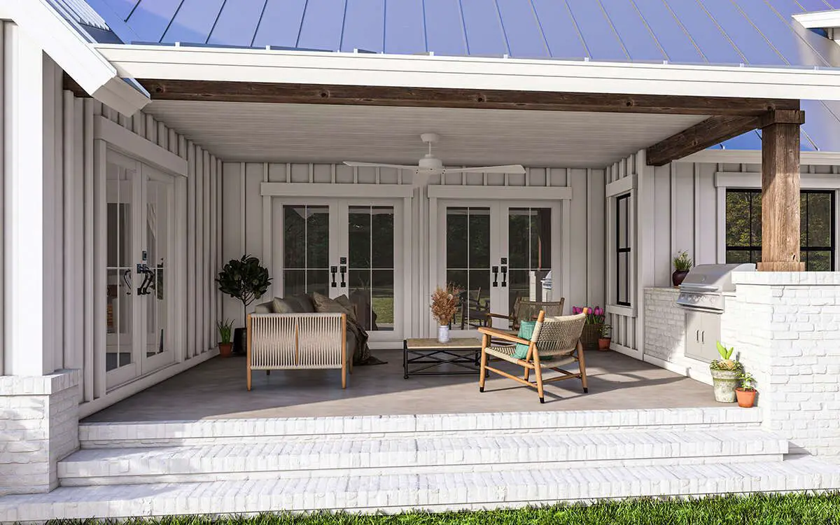 Step inside and the home makes smart use of space. The layout is designed to feel open and bright, helped by all those multi-panel windows that pull natural light deep into the living areas. You get that airy farmhouse feel without wasting square footage on long, empty hallways.