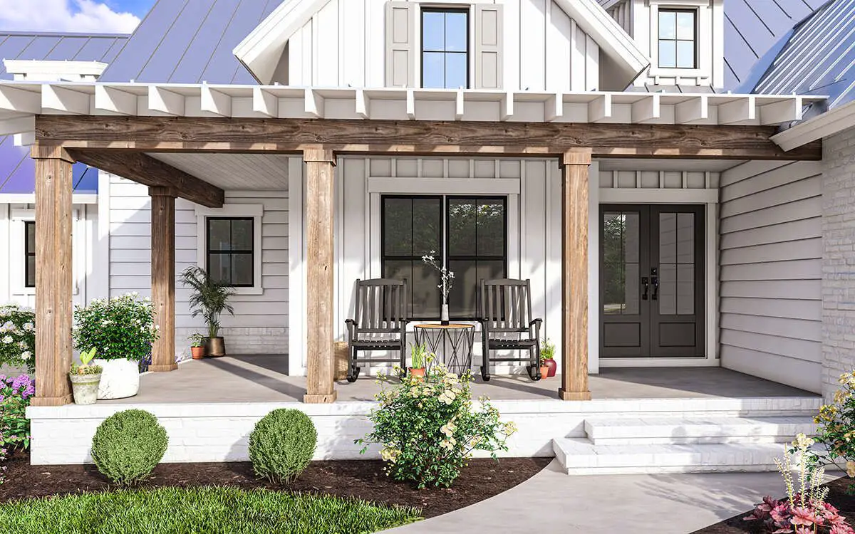 Front porch lovers, this is your moment. The wraparound covered front porch is designed with a comfortable 6-foot depth, which is the difference between “cute photo porch” and “real porch where you actually sit.” Rocking chairs, potted plants, morning coffee, evening chats—it all fits.