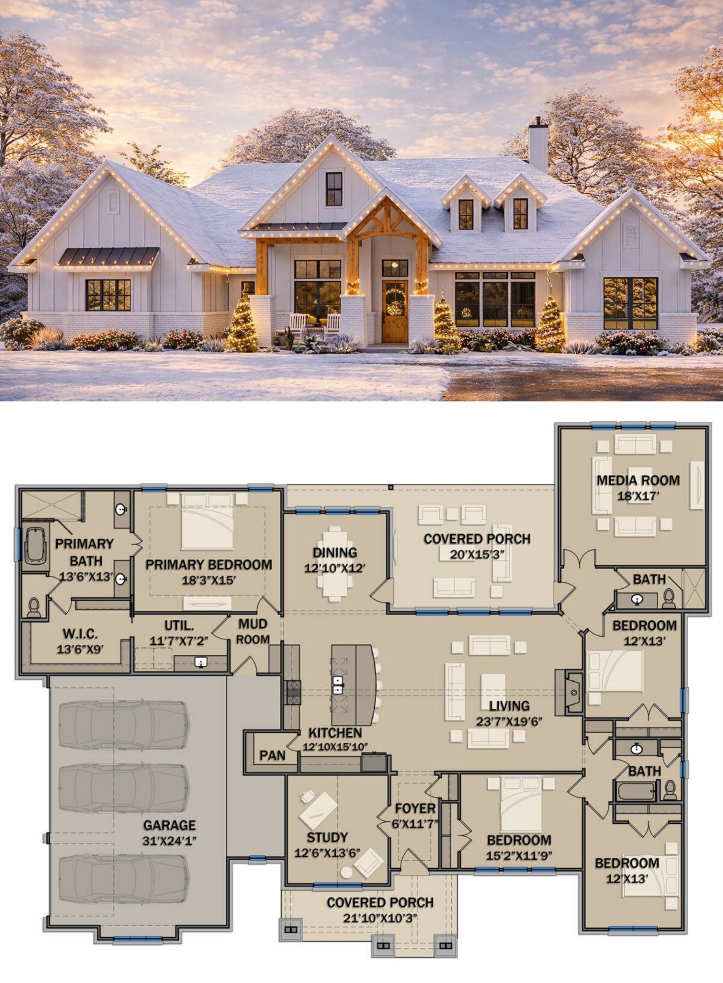 With about 3,220 square feet of living space, the plan features **4–5 bedrooms**, **3 full bathrooms**, and a **3-car garage**, offering plenty of room for family, guests, work, and leisure. 0