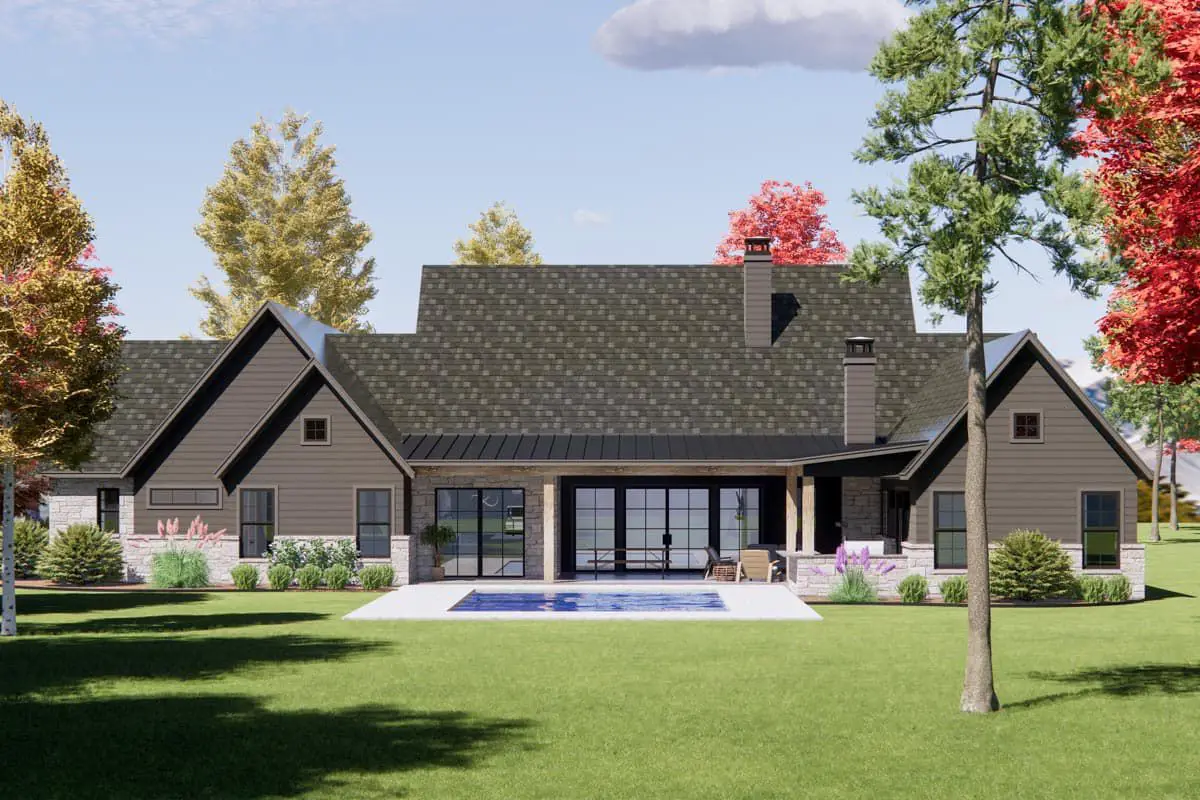 The front elevation leads with balance and confidence. A mix of stone and wood tones gives it that “custom home” presence, while the transitional styling keeps everything clean and modern.