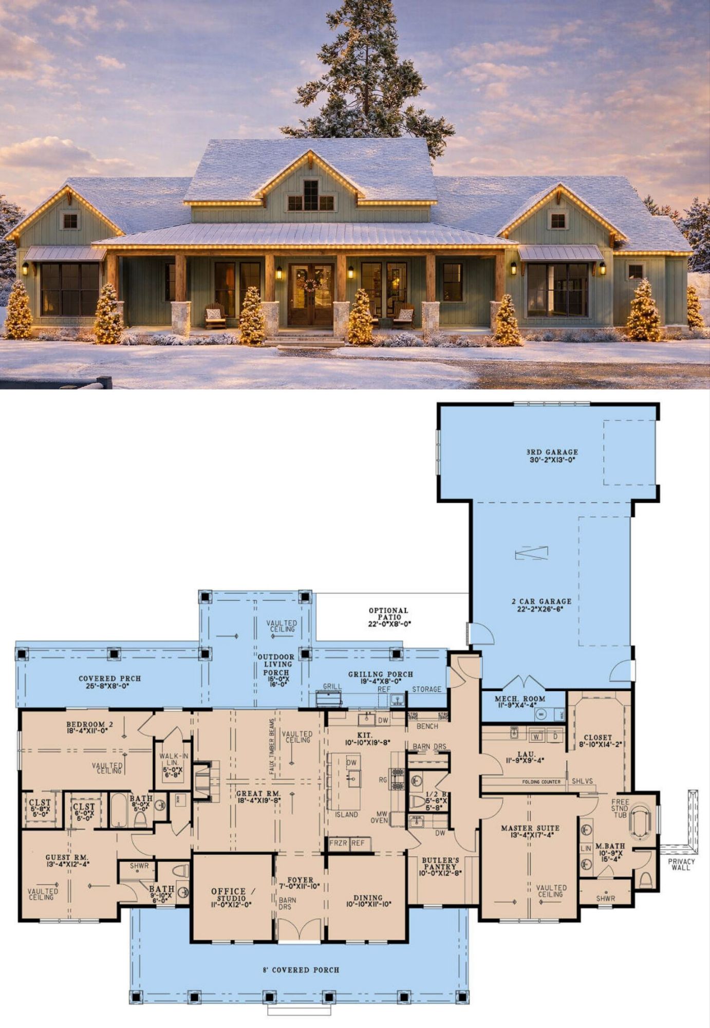 Modern farmhouse style is all about that clean, confident look—welcoming without feeling fussy. This home’s footprint is substantial (in a good way), with an overall size of about 89′ 9″ wide by 84′ deep.