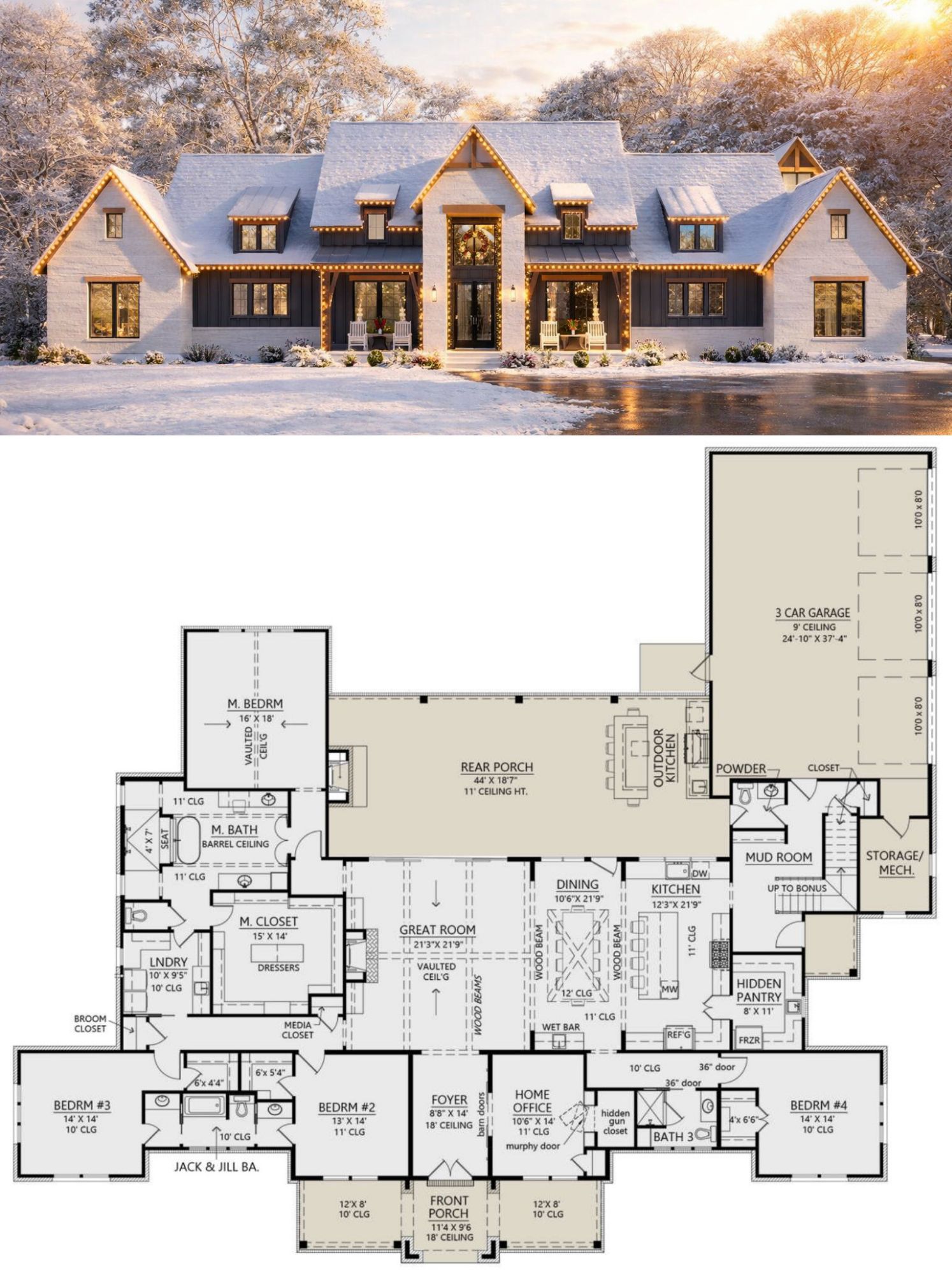 This modern farmhouse plan is ideal for families who want open, connected living spaces without sacrificing private retreats. The generous layout supports daily routines, large gatherings, and comfortable family living. With easy access to outdoor areas and plenty of room for personal space, it adapts well to both everyday life and special occasions. 11
