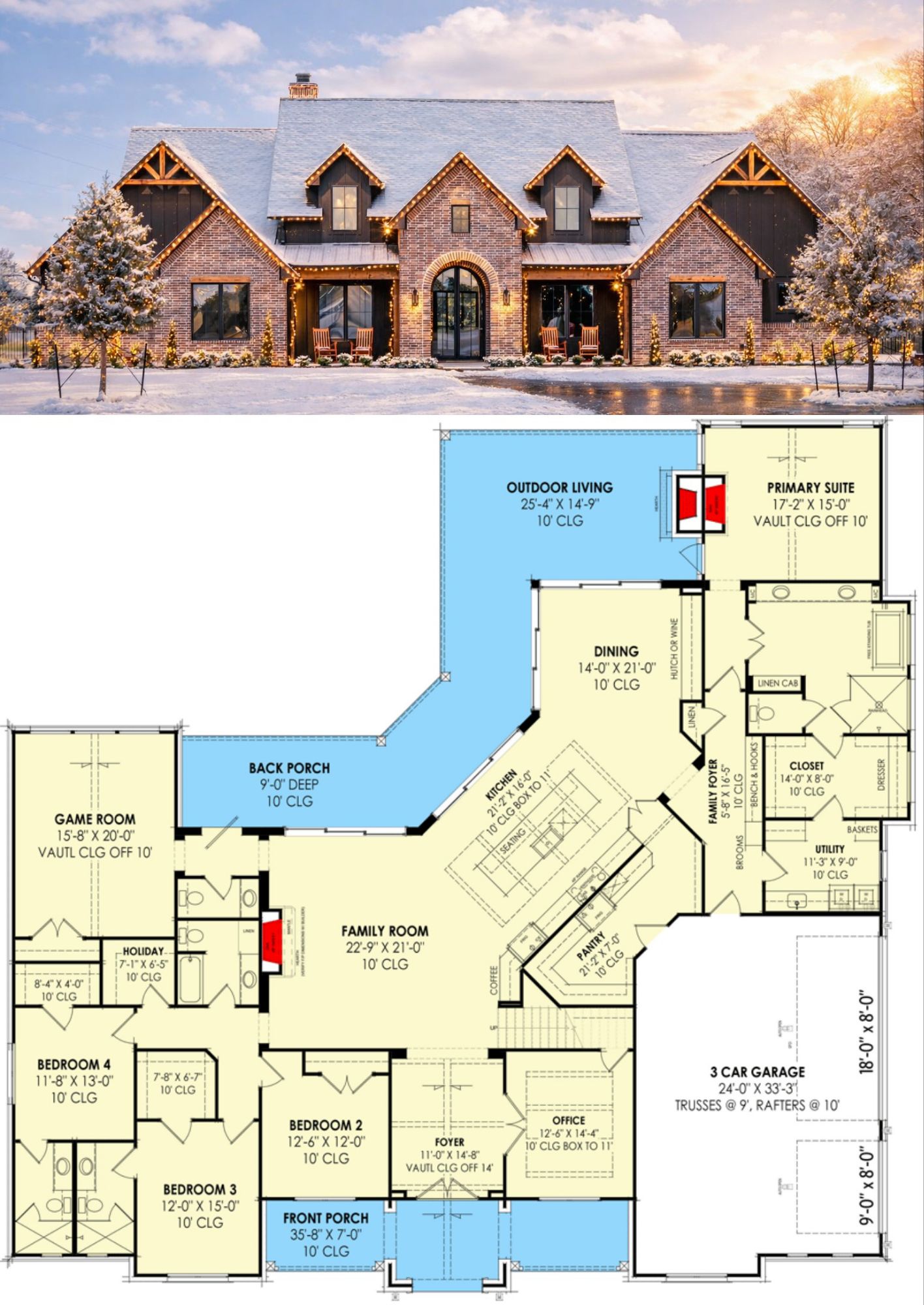 This design is basically a masterclass in “separate-but-together.” You get a strong central living core for connection, a dedicated kids’ wing with a game room for everyday chaos control, and a private primary suite that feels like a resort upgrade.