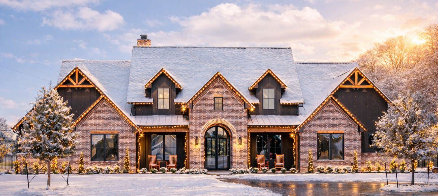 The first impression here is strong—clean symmetry, a confident roofline, and a transitional blend that feels timeless instead of trendy. Picture brick paired with warm wood tones and a touch of metal for contrast. It’s polished, but not stiff.