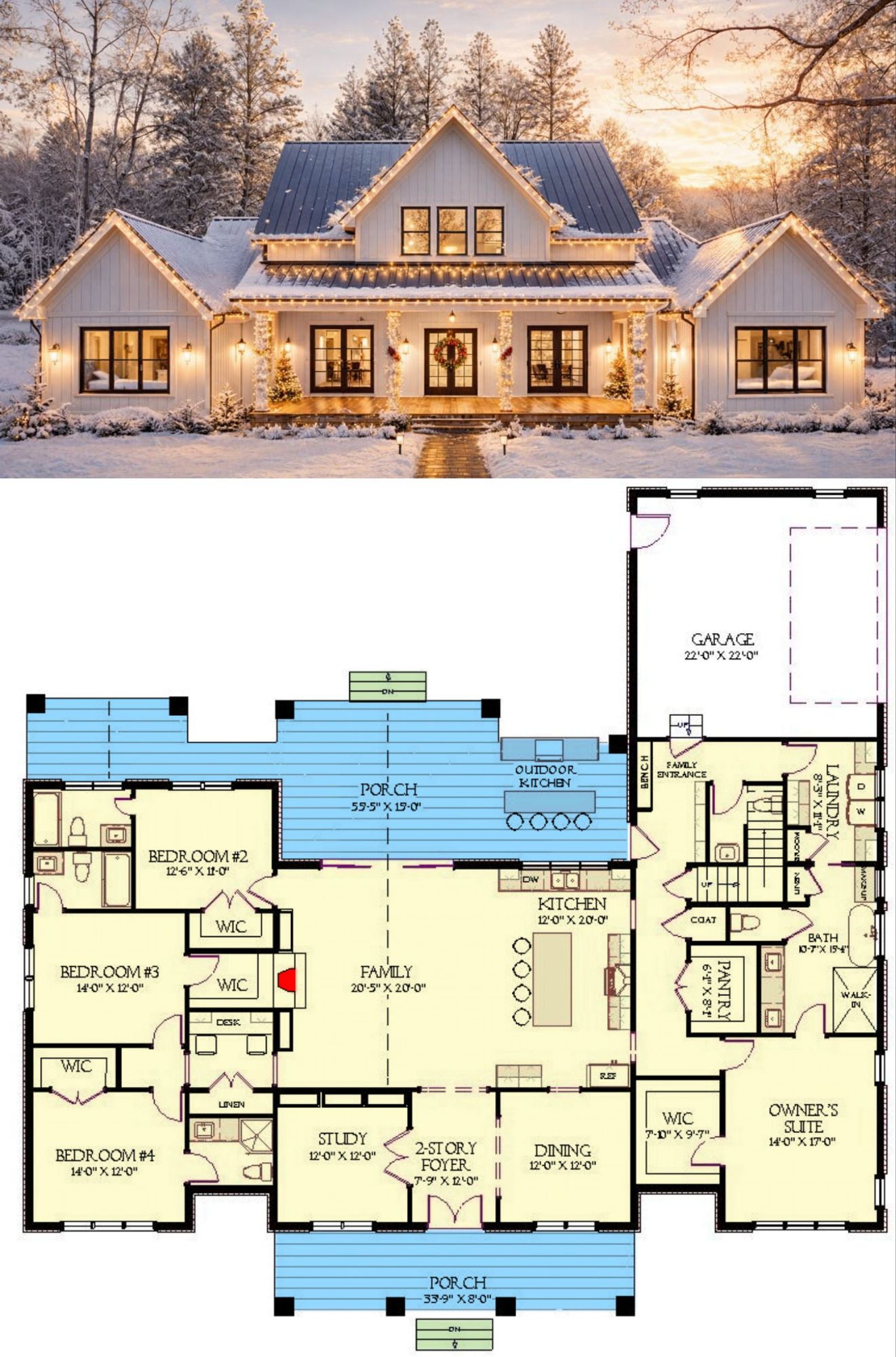 This modern farmhouse plan is designed for households that value open gathering spaces, flexible room configurations, and seamless indoor-outdoor living. The inclusion of an outdoor kitchen elevates everyday living while the split bedroom layout and office space support both privacy and shared time.