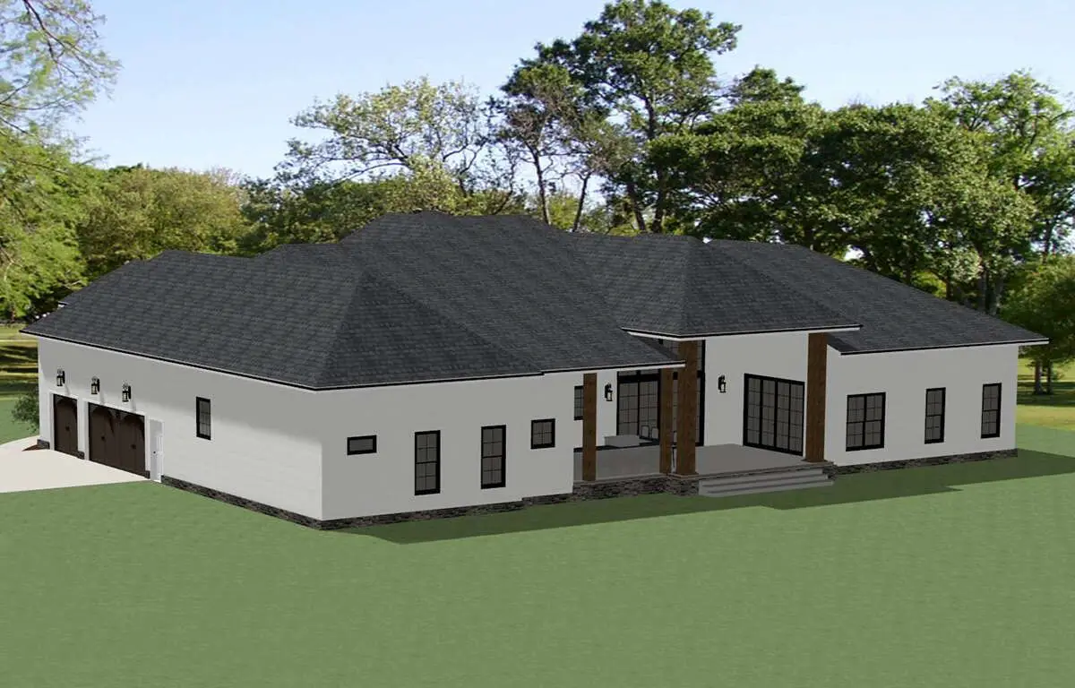 Modern transitional style is all about balance—clean lines with inviting details—and this home wears that look beautifully. The wide footprint gives it an upscale presence, while the front porch adds that friendly “welcome home” feeling. The side-entry garage is a huge curb-appeal upgrade too, because the front elevation stays architectural and elegant instead of looking like a parking lot with windows.