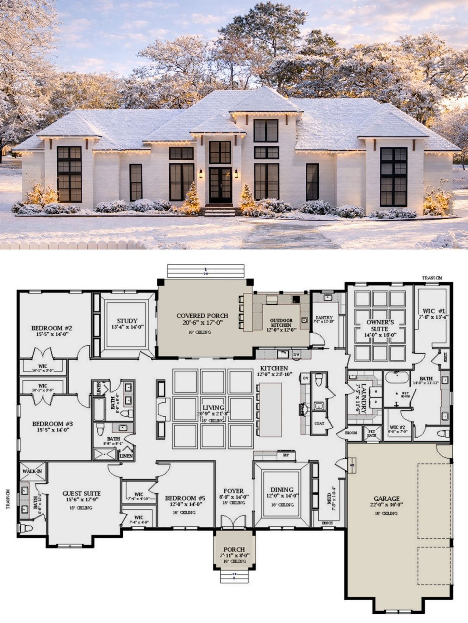 With an overall width of 93′ 8″ and depth of 71′ 8″, this is a substantial home that sits confidently on the lot. And at roughly 28 feet in height, it still maintains a grounded, one-story profile—grand, but not towering.