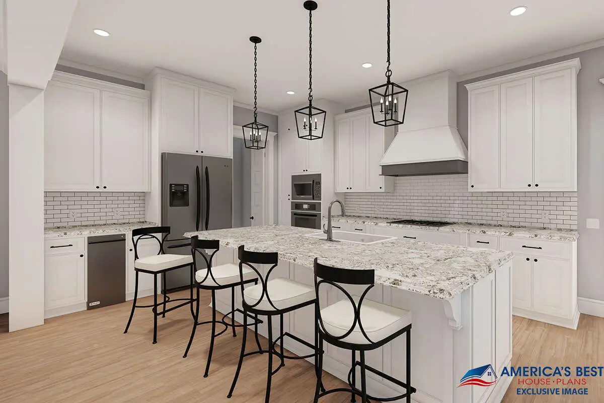 This modern farmhouse plan balances communal spaces with private retreats. The open layout keeps family and guests connected, while separate bedroom zones ensure quiet and personal comfort. Functional features like ample pantry space, a mudroom, and laundry area make daily life easier and more organized. 21