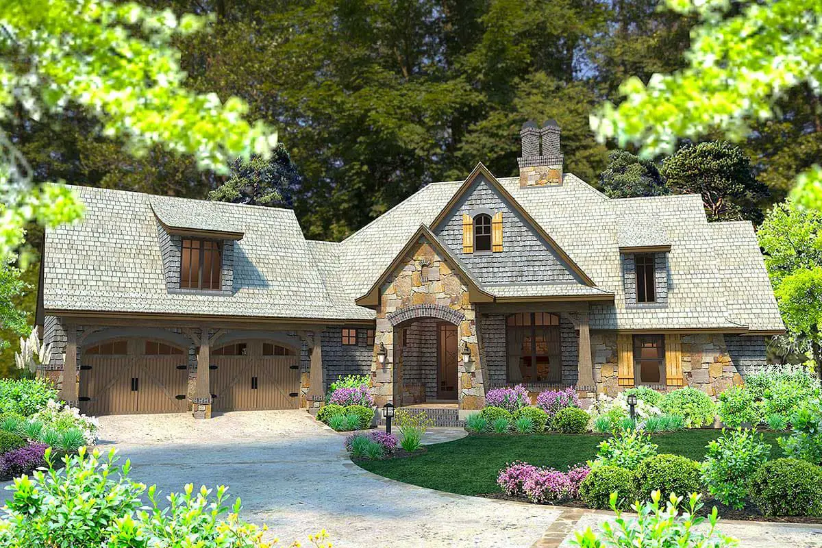 Styled to fit naturally into wooded lots, hillside sites, or scenic mountain settings, the exterior combines Craftsman and rustic influences with clean lines and sturdy proportions. The angled attached garage and courtyard entry create visual interest while remaining highly functional.