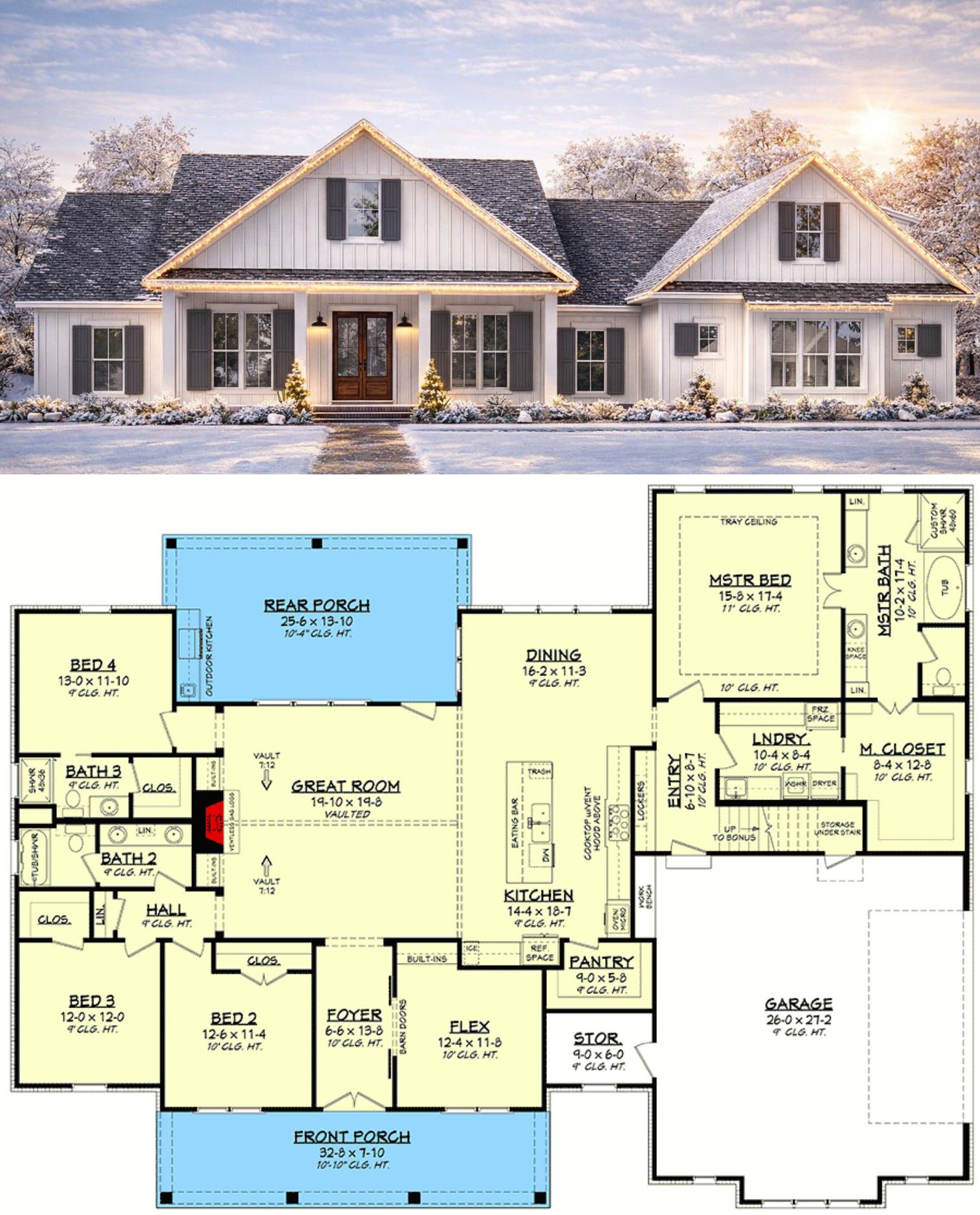 This stunning **New American house plan** blends classic country charm with modern livability.