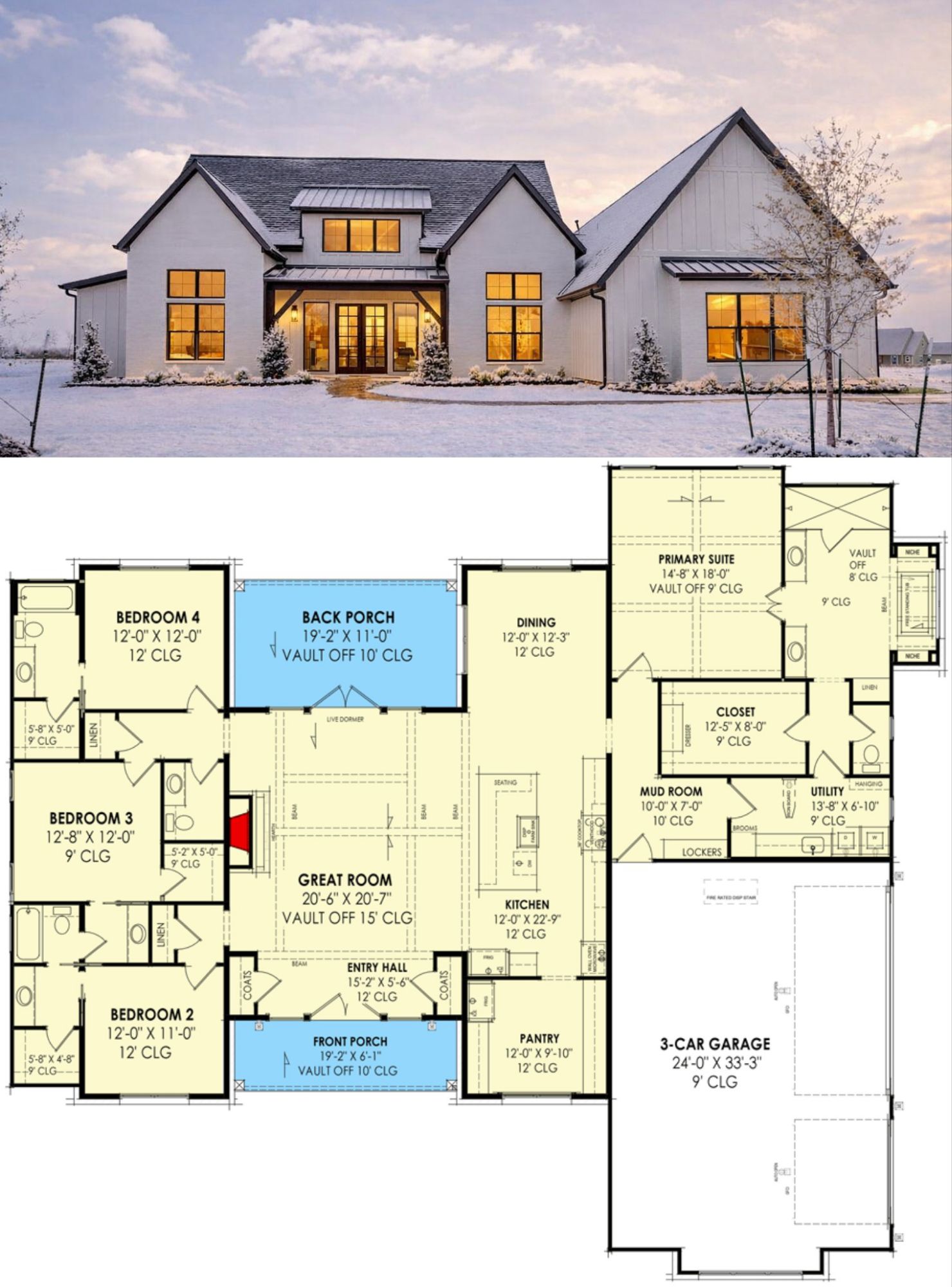 This transitional farmhouse offers a balanced plan for modern family life: open gathering spaces bring people together, while split bedroom zones provide privacy when needed. Natural light from front and rear French doors brightens the interior and connects living spaces to outdoor porches. Practical details like the walk-in pantry, mudroom with lockers, and laundry access from the primary suite make daily living smoother. The optional bonus room adds flexibility for changing needs — whether that’s a media hub, home gym, or creative studio.11