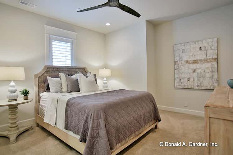 The primary suite is set apart from the secondary bedrooms to create a private retreat. It includes a sitting area with porch access, which enhances indoor-outdoor connection and comfort.