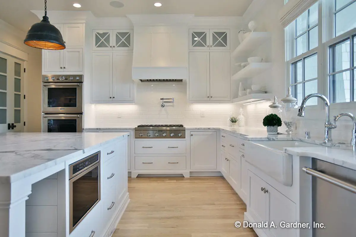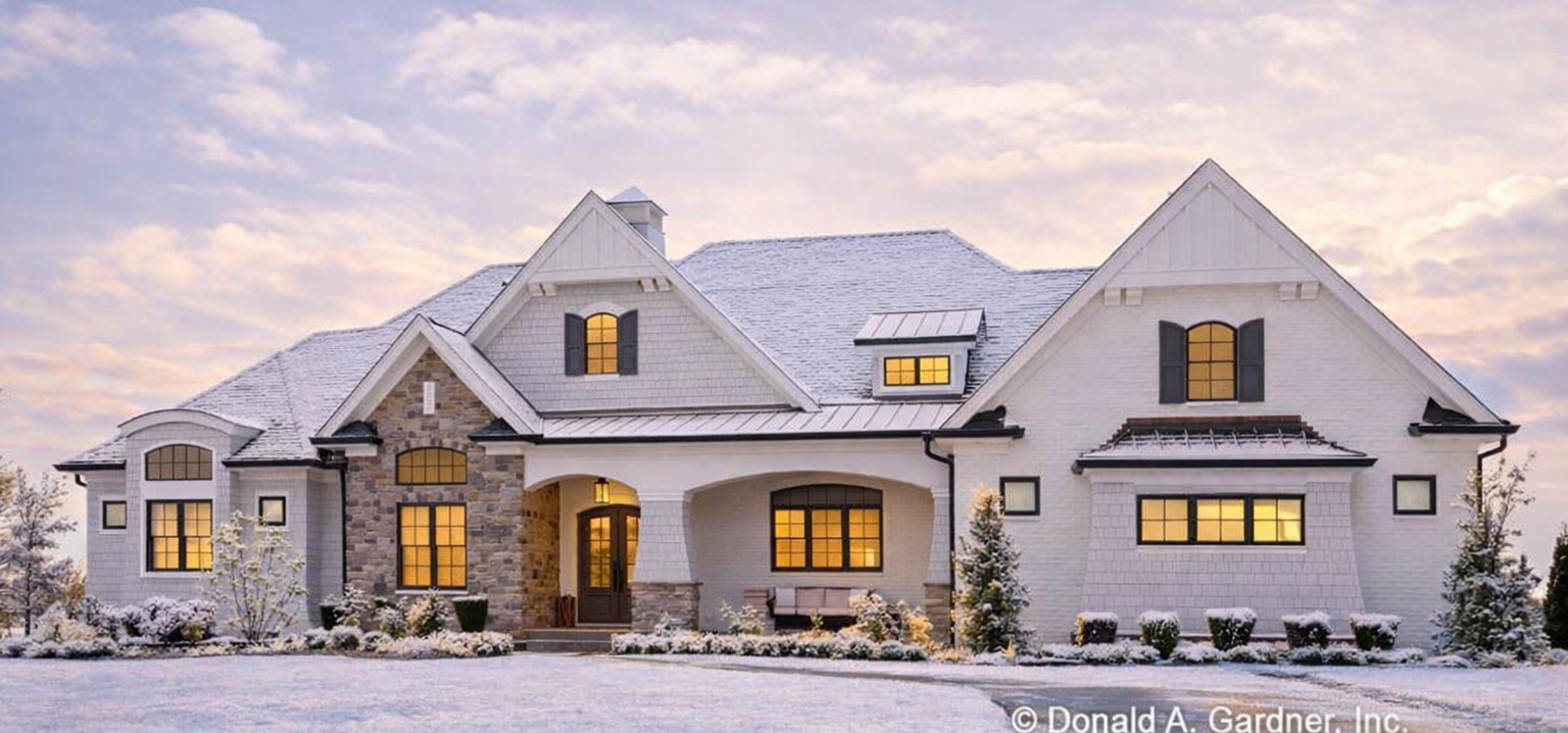 The side-entry attached garage keeps the façade clean and homespun yet elegant. With an overall width of 89′-6″ and a depth of 78′-0″, the home sits comfortably on larger lots and provides a substantial street presence.1