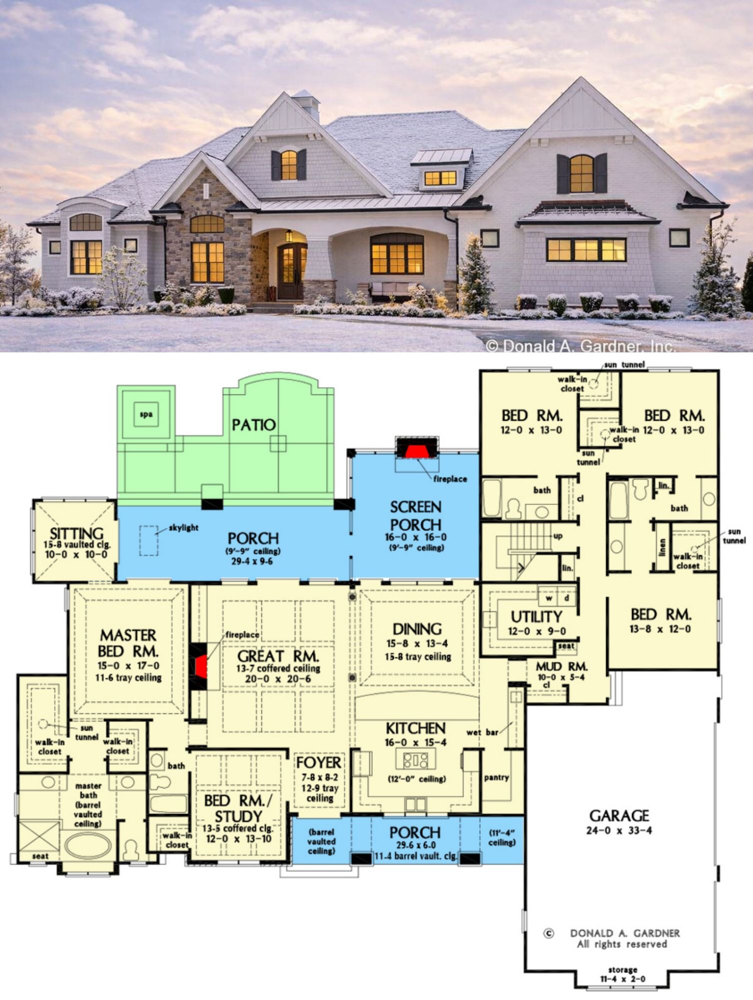 - Roof: 12:12 primary/secondary pitch