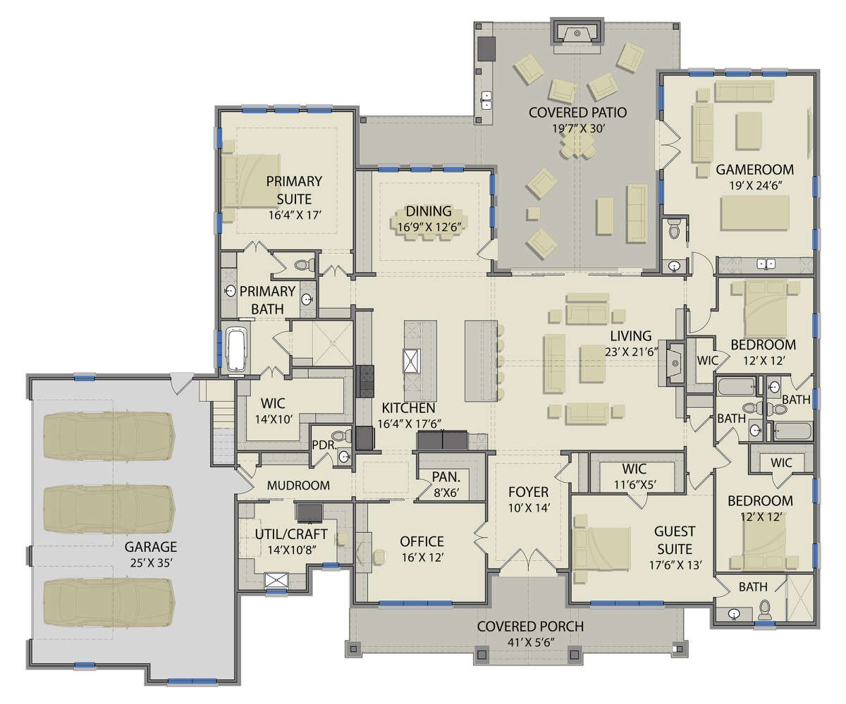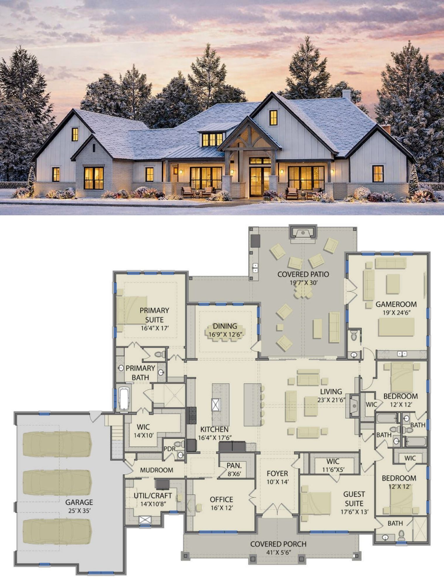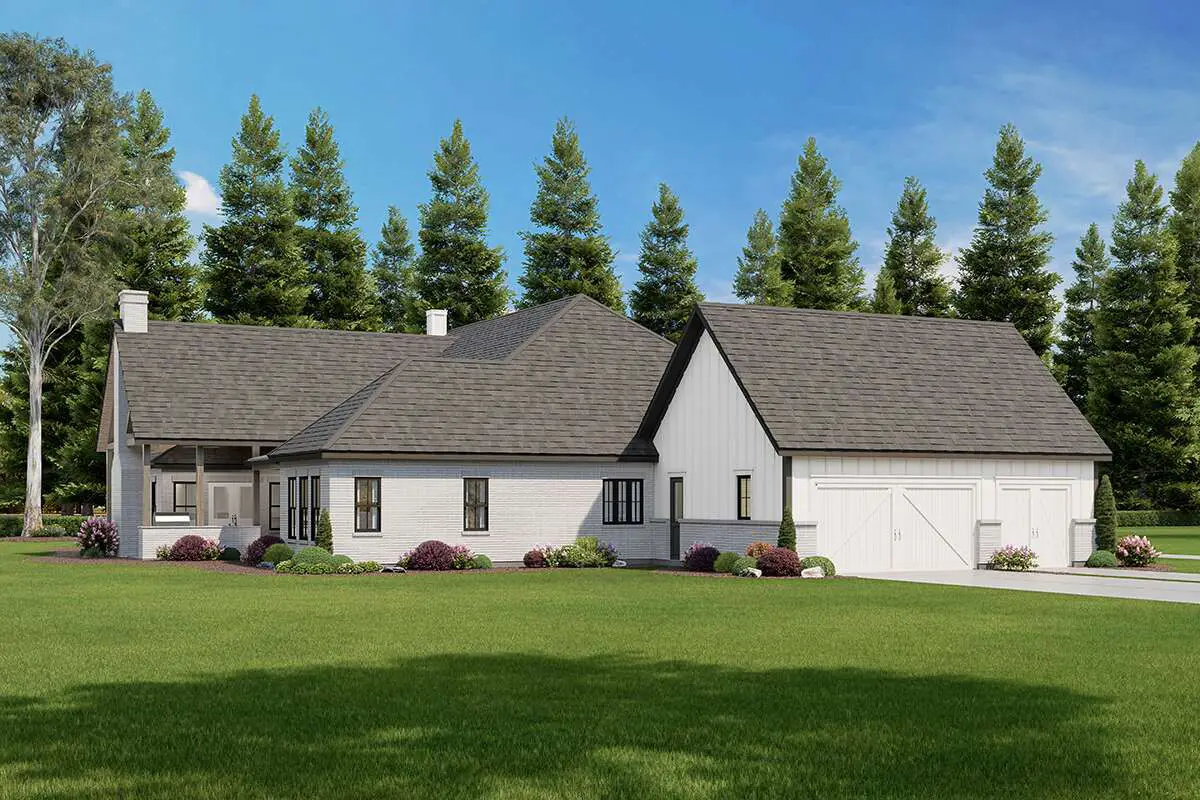 This modern farmhouse blends broad open living with thoughtful private spaces in a smart one-story layout.