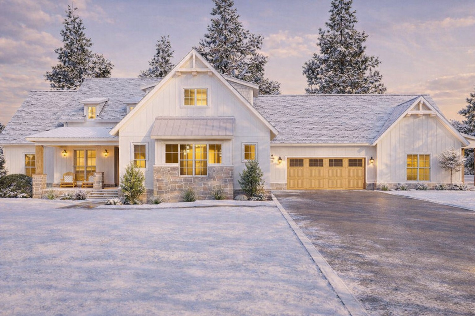 A combination of board-and-batten siding with mixed textures provides visual interest, while the overall silhouette feels grounded and timeless. The side-entry four-car garage keeps the front façade clean and refined, contributing to strong curb appeal.1