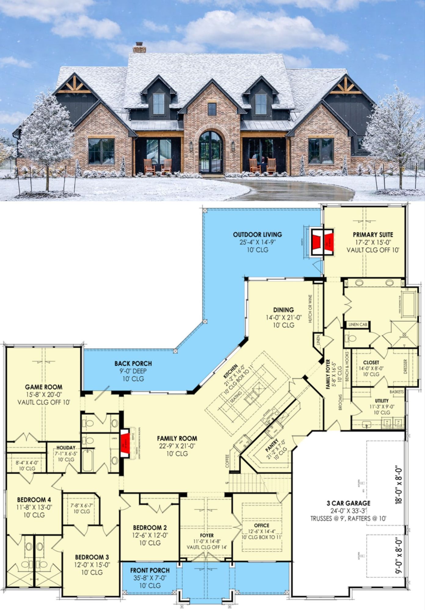 This beautifully balanced transitional design offers about 4,032 square feet of heated living space with four bedrooms, four full baths, a half bath, and a three-car side-entry garage.