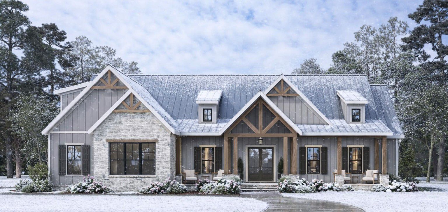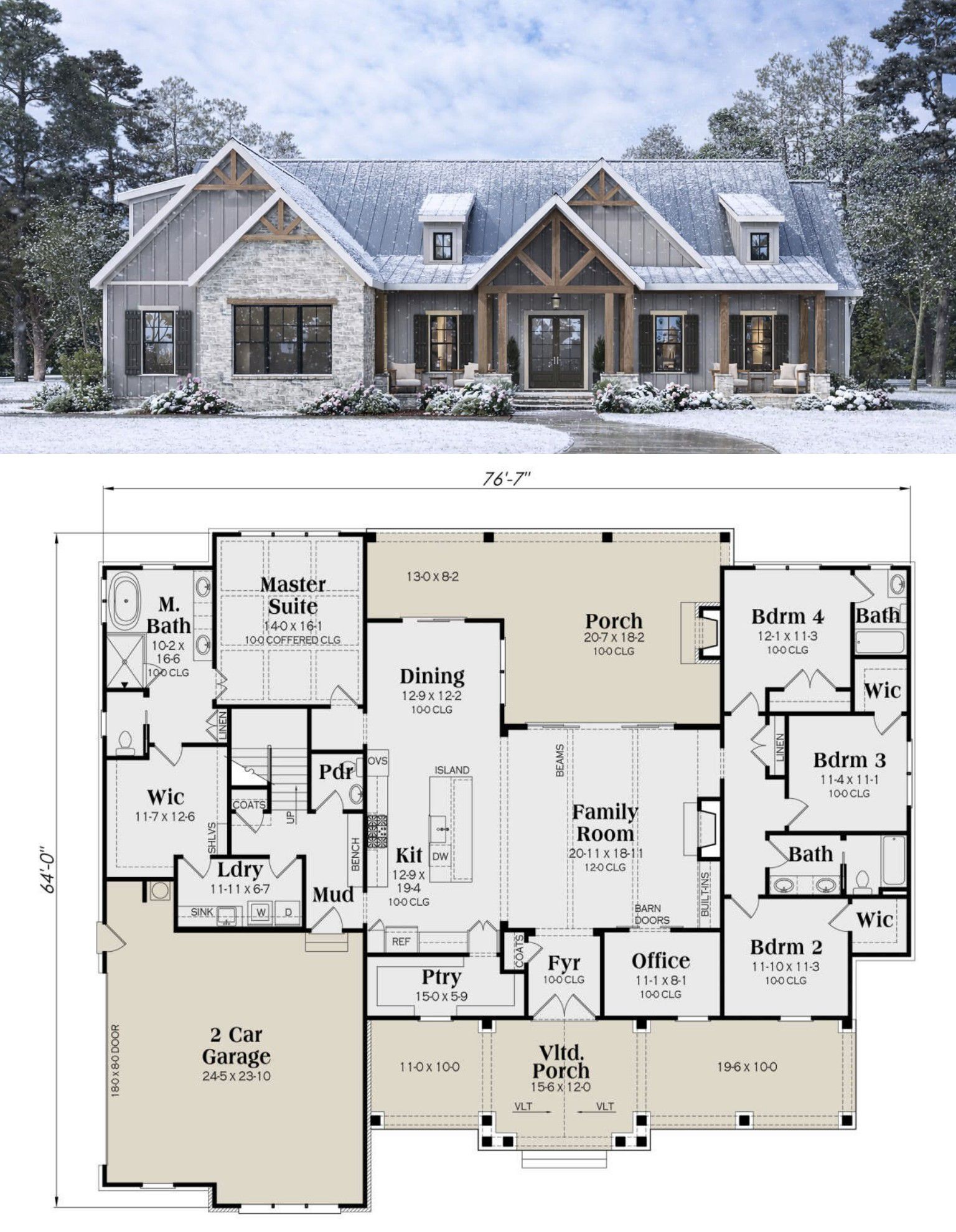 With a width of 76′ 7″ and a depth of 64′, the home has a substantial presence—wide enough to feel grand, but still practical for many lots. And because the house is primarily one level, the roofline tends to feel lower and more approachable, which is exactly what many people love about farmhouse-inspired designs.