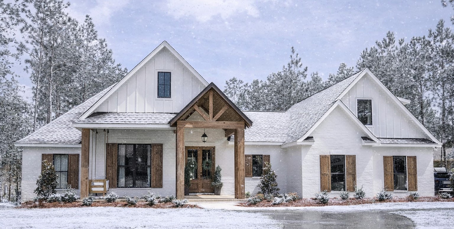 The exterior design blends classic French Country proportions with modern simplicity. A prominent entry gable and tasteful window shutters give the façade a timeless feel that’s both elegant and approachable, while balanced rooflines and mixed exterior elements create lasting curb appeal.